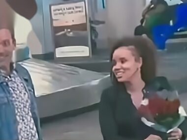 A woman says goodbye to her “traveling boyfriend” at airport baggage claim — and seconds later her husband appears with flowers, stunning everyone nearby. But look closely at the monitor: this isn’t security footage at all, it’s a production feed, and the on-screen file name gives away what’s going on.