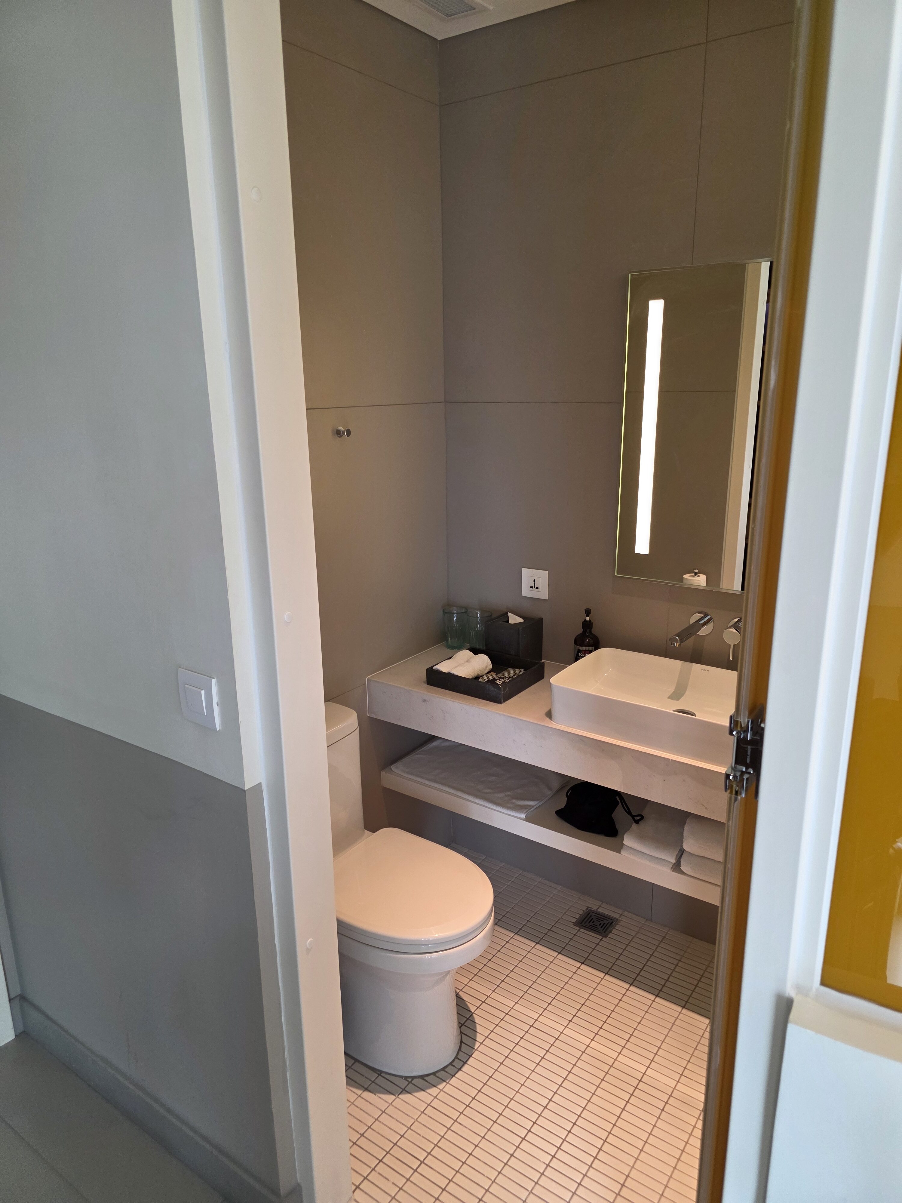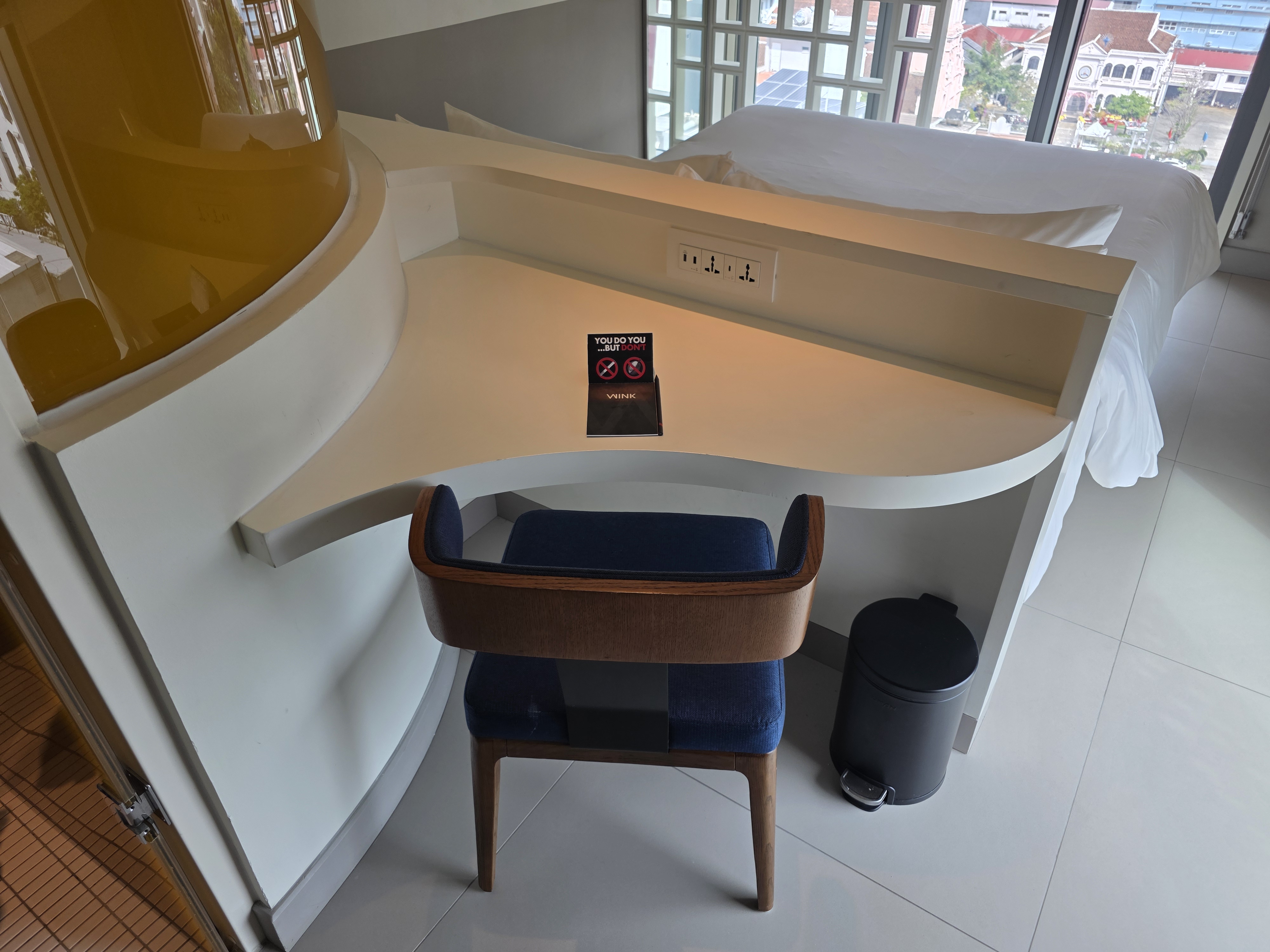 Opposite this was the bathroom which featured a stand-up shower and Wink branded amenities. In front was a built-in desk with power outlets and a chair, which provided a nice space to work without going upstairs to the co-work space.
