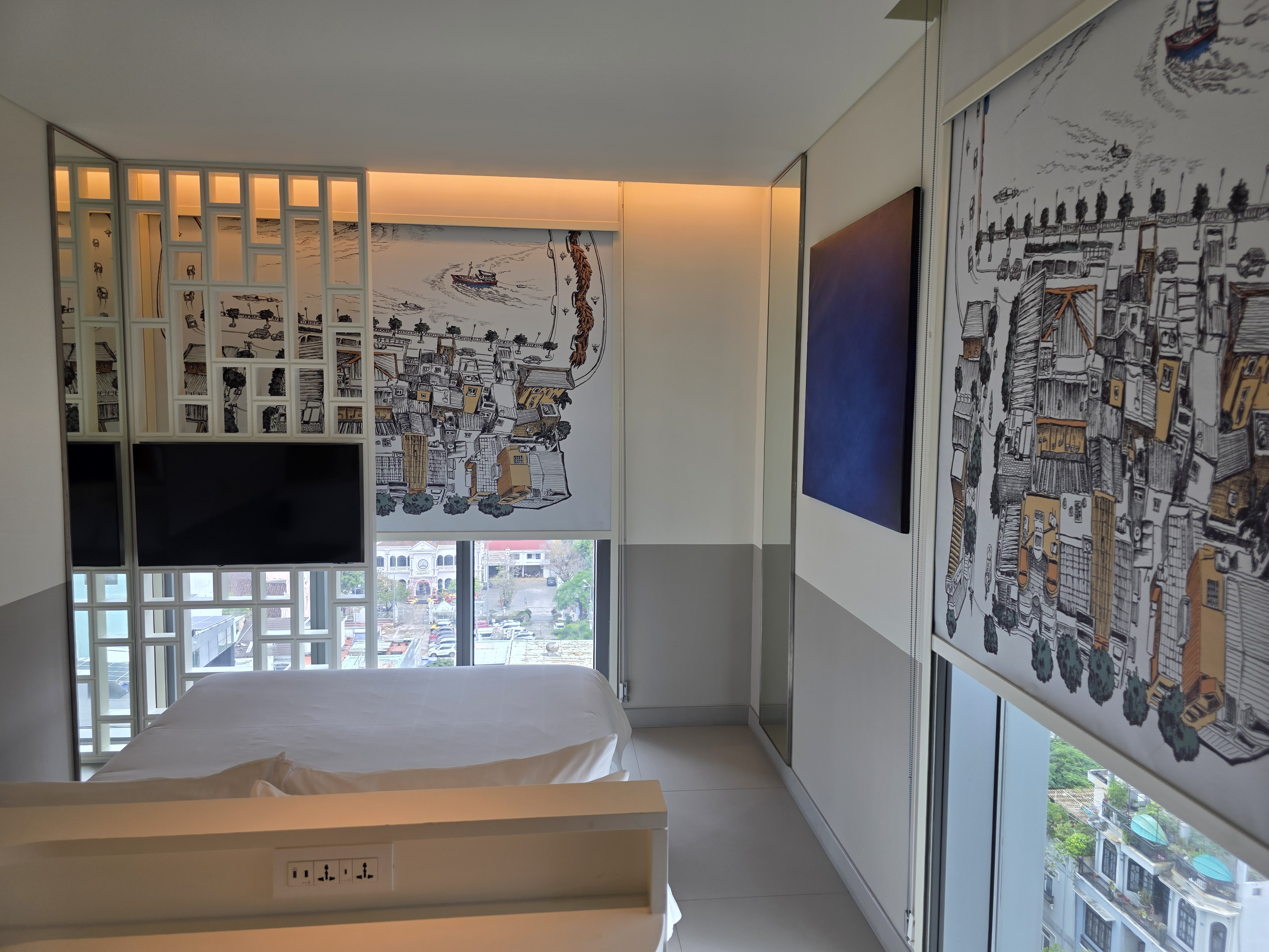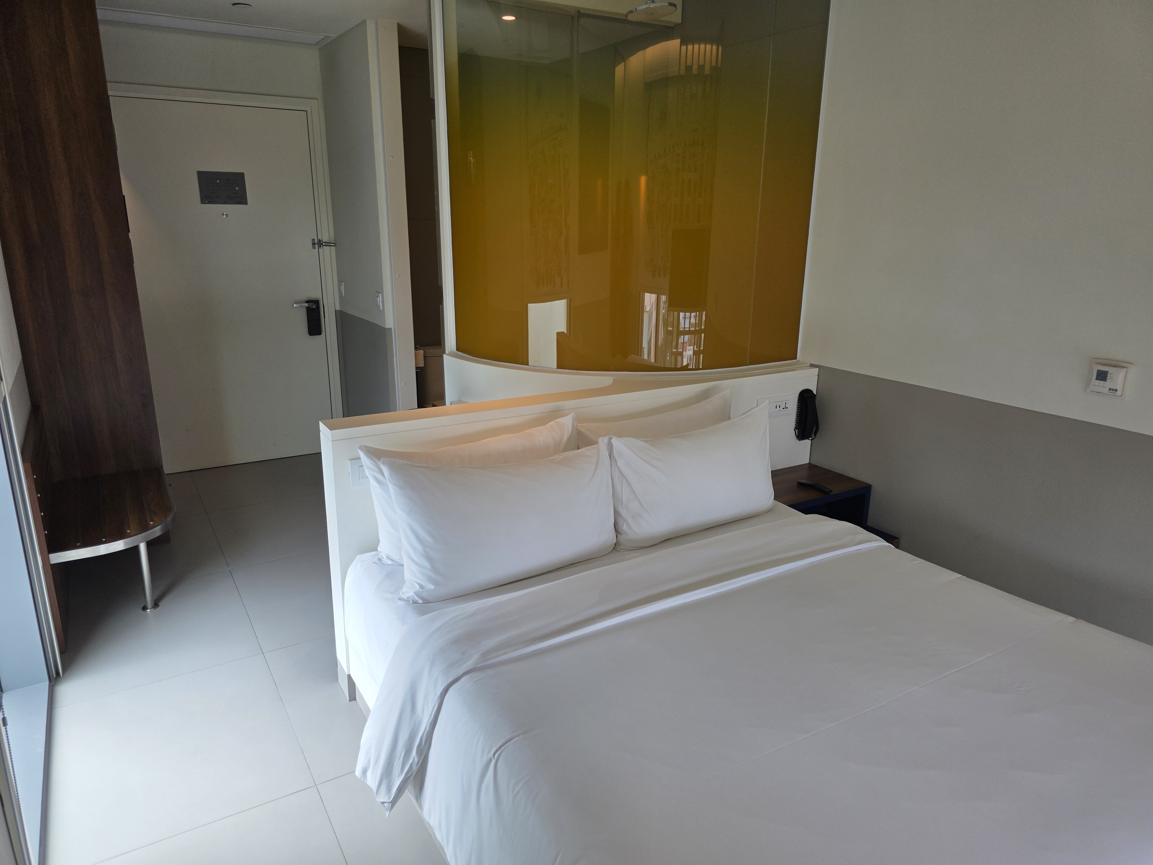 The room featured floor to ceiling windows with roll-down black-out curtains which worked well to keep the room dark for a quick afternoon nap. The queen-size bed was comfortable, and the bedside table featured additional power outlets. The 32” smart TV featured local and international channels, a YouTube app, and the ability to cast from your device.
