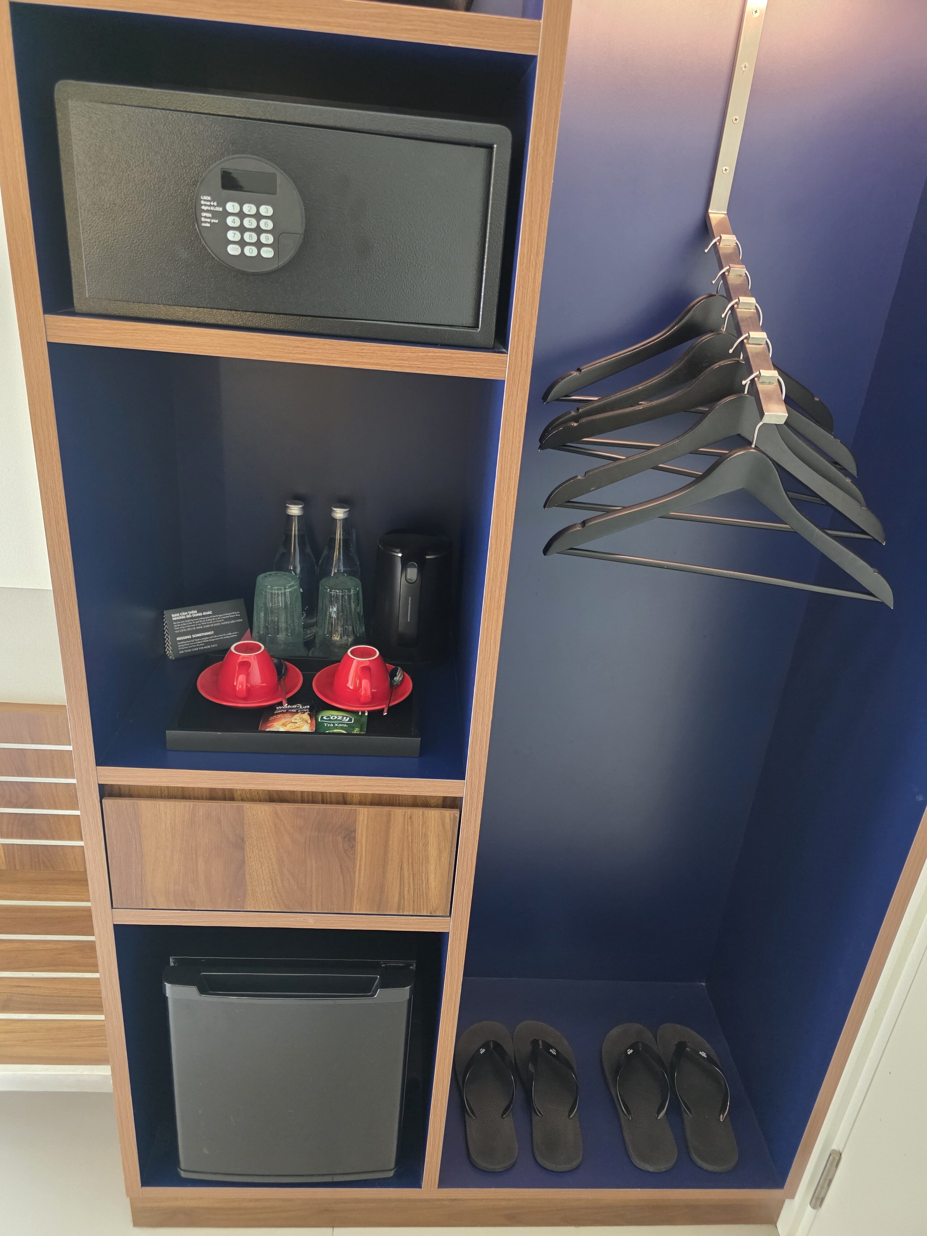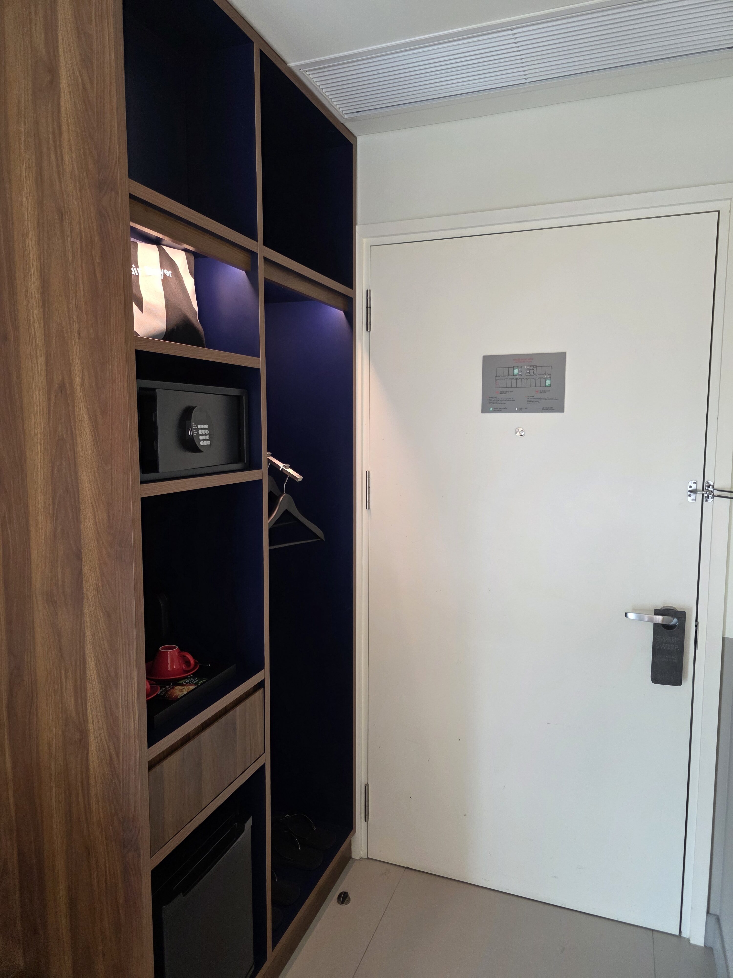 My room was located on the 8th floor at the end of the hall. The room was small but well laid out. Immediately inside was a wardrobe with a small coffee station, a safe, and a mini fridge.
