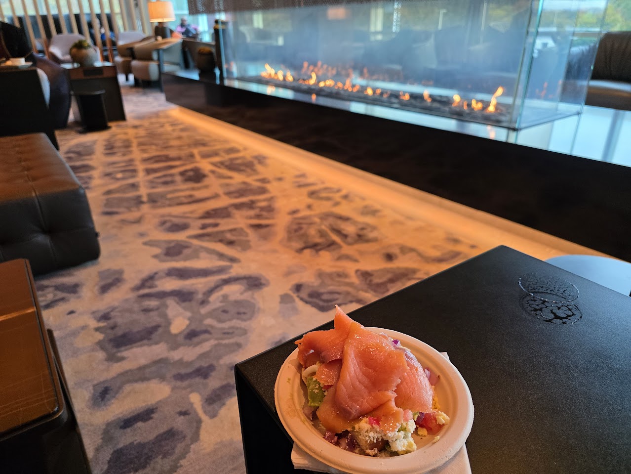I figured I’d try breakfast at the Capital One Landing at National airport instead. I didn’t have high hopes. I like the afternoon meals, and almost never fly out early enough to try their morning fare. It’s breakfast! No one does that well in an airport. Or, as I think on it, the only breakfast I was actually happy with in a U.S. airport ever really was smoked duck eggs benedict and potato latkes in the Newark United Polaris lounge.