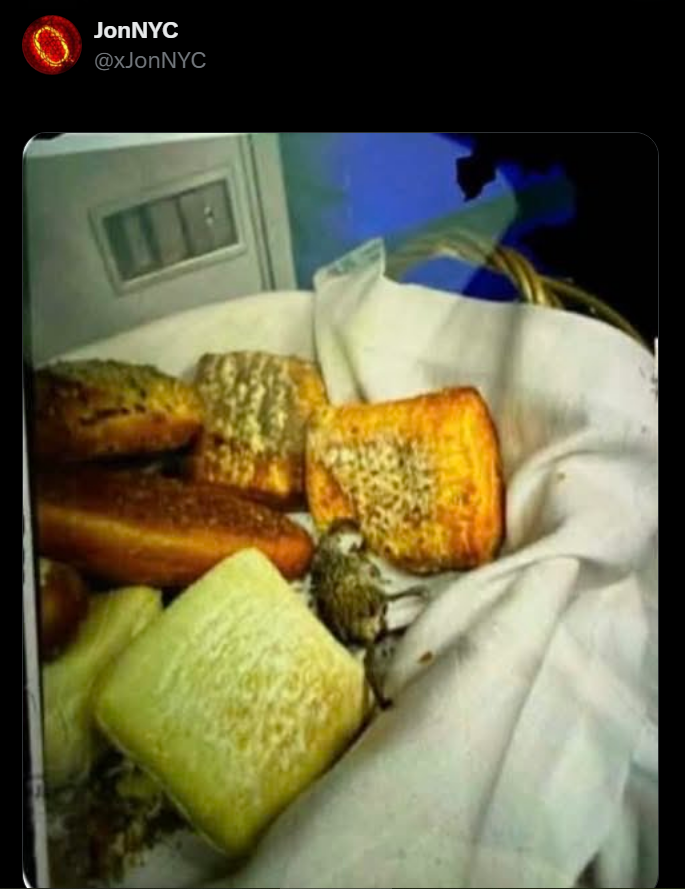 American has been surprisingly tight-lipped about the issue. Aviation watchdog JonNYC tweets out a photo of catering issues indicative of what’s believed to have been happening at the catering facility – it shows mice nestled in bread on an American Airlines Boeing 777.