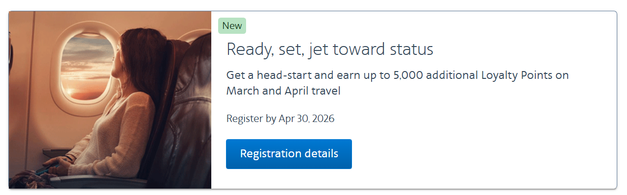 - Log into your account. Under promotions I’m seeing – and several readers report – Ready, set, jet toward status. Register by April 30 (and prior to booking a flight) to earn bonus Loyalty Points on each flown segment, up to 5,000 points, for travel completed by April 30.
