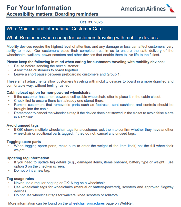 - American, which has more mishandled wheelchairs than anyone else by a lot, is reminding employees about proper procedures.