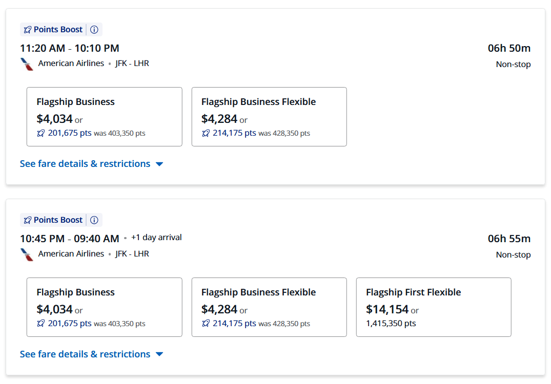 It’s super-interesting to see American Airlines flights coming up as Points Boost opportunities through the Chase travel portal, since American is cobrand partners with Citi. You can now use Chase points at 2 cents apiece to book American Airlines business class (and in some cases, domestic first) and premium economy is boosted, too.