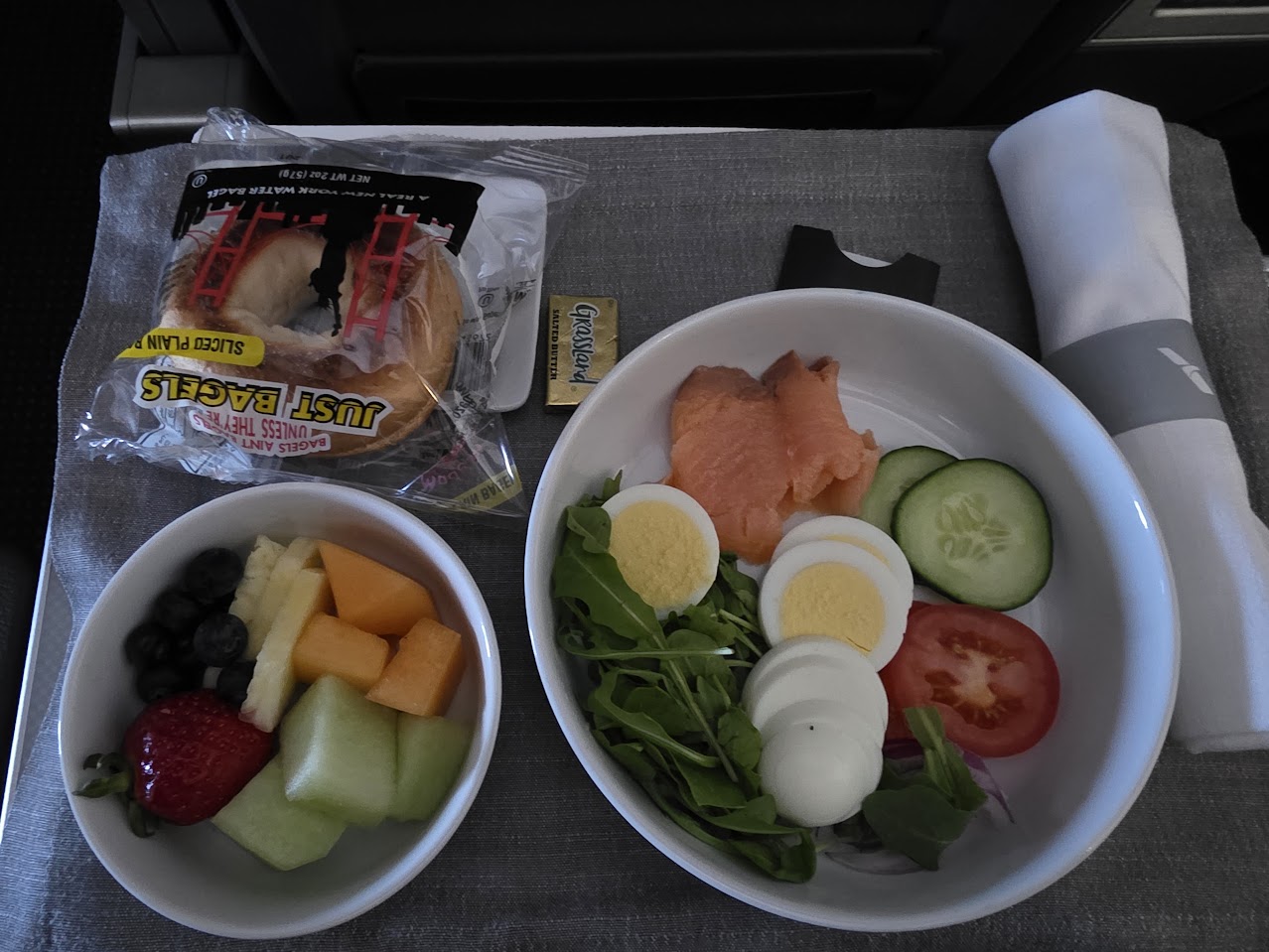 I’d also add that the bagel was cold, in a shrink-wrapped package, and not fully sliced. It took real effort to keep it in one piece as I finished separating top from bottom with my knife. The quantity of smoked salmon was not exactly generous… but it was fine, because the bagel itself was small. And the blueberries in the fruit side were exceptionally sour.