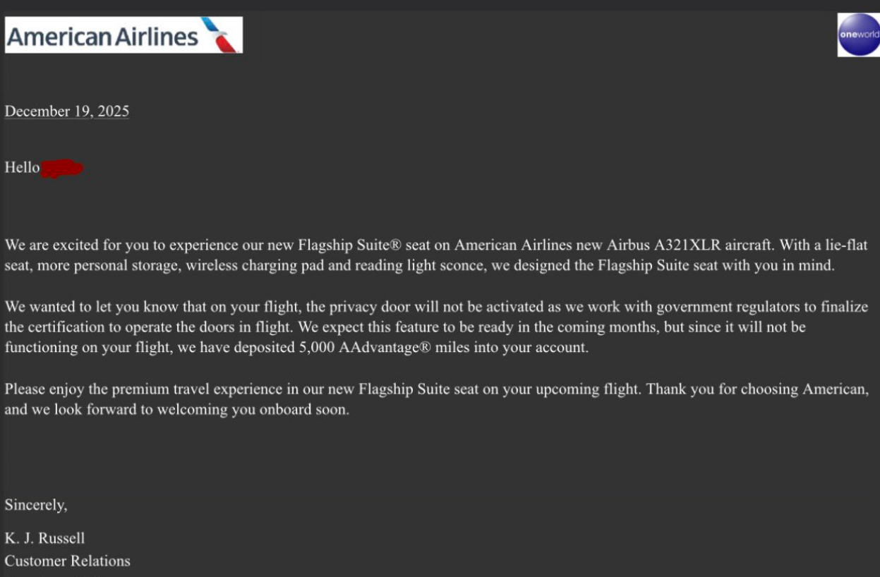 A reader shares that American is proactively notifying passengers booked in business class on this aircraft about the limitation, and compensating with 5,000 AAdvantage miles.