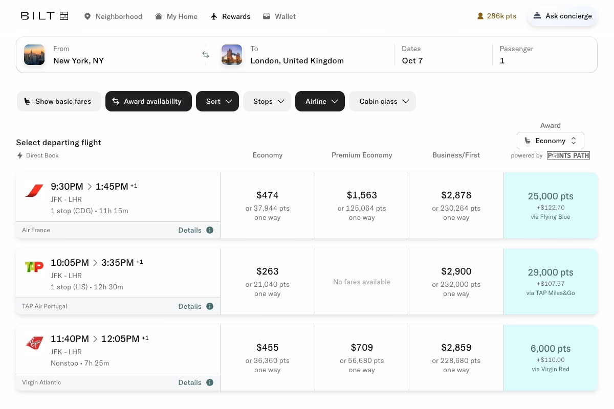 This first phase also covers flights operated directly by each airline. In the coming weeks, we’ll begin expanding to include flights across alliances, meaning you’ll soon be able to find awards bookable across the networks of our airline partners using points transferred from Bilt, all within the same interface alongside cash pricing.