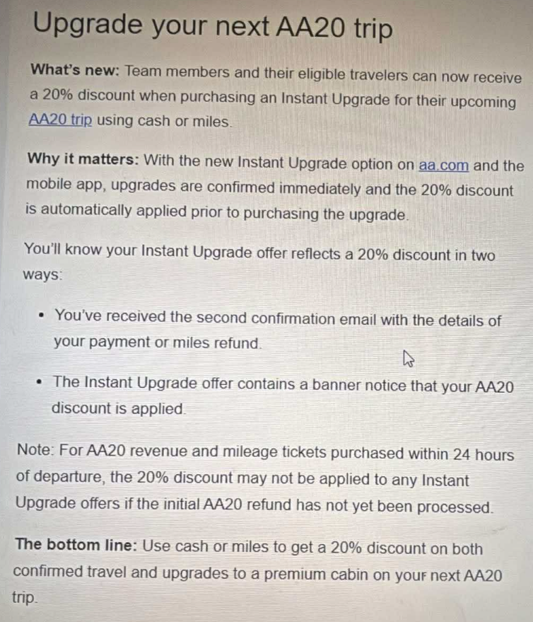 - The American Airlines employee/family ‘AA20’ 20% discount now extends to cash and miles upgrades.