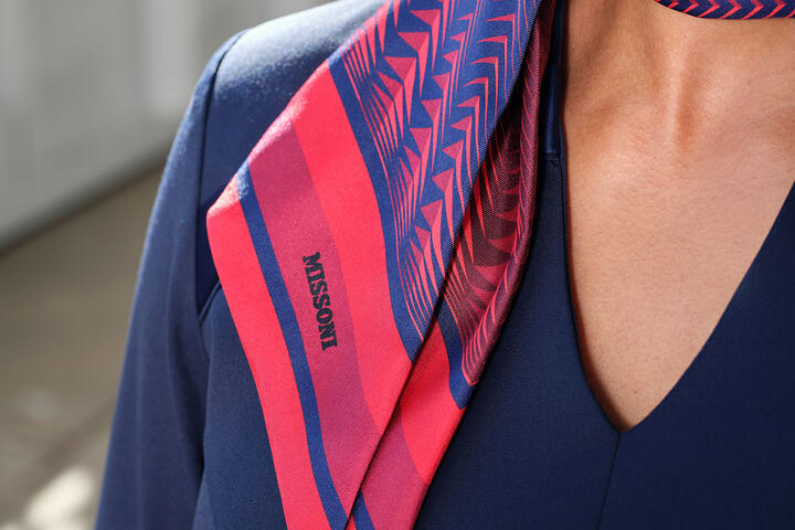 Scarves, ties, and pocket squares that accompany the uniforms are designed by Missoni, which Delta leans on for inflight amenities. And Bombas is supplying black socks with Delta detailing.