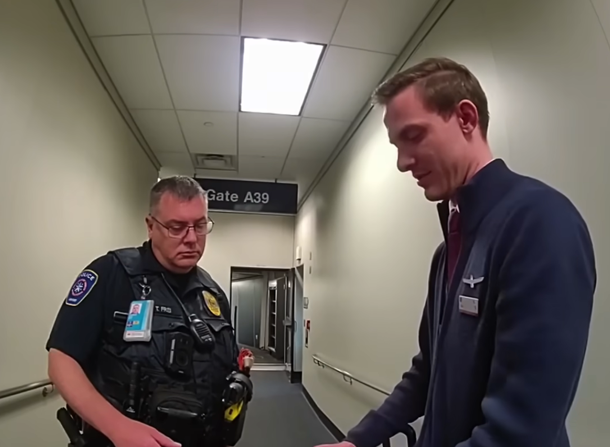 Later, in the back seat of a police car, the flight attendant alternated between pleading to go home and continuing agitation. He kicked the door despite multiple times and was told he’d face “felony criminal mischief” for vehicle damage. An officer also states “public intox, assault, harassment of a public servant” (spitting on an officer). They keep the spit hood on and note he’s under arrest.