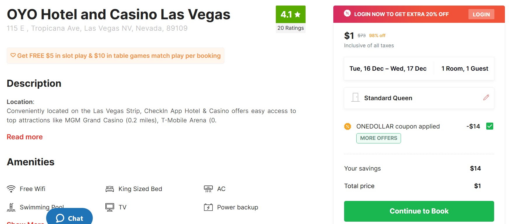 OYO Hotel and Casino Las Vegas is available for $1 per night Monday – Wednesdays with coupon code ONEDOLLAR.