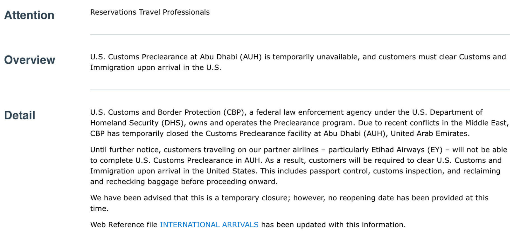 - U.S. immigration preclearance at Abu Dhabi has been temporarily closed.