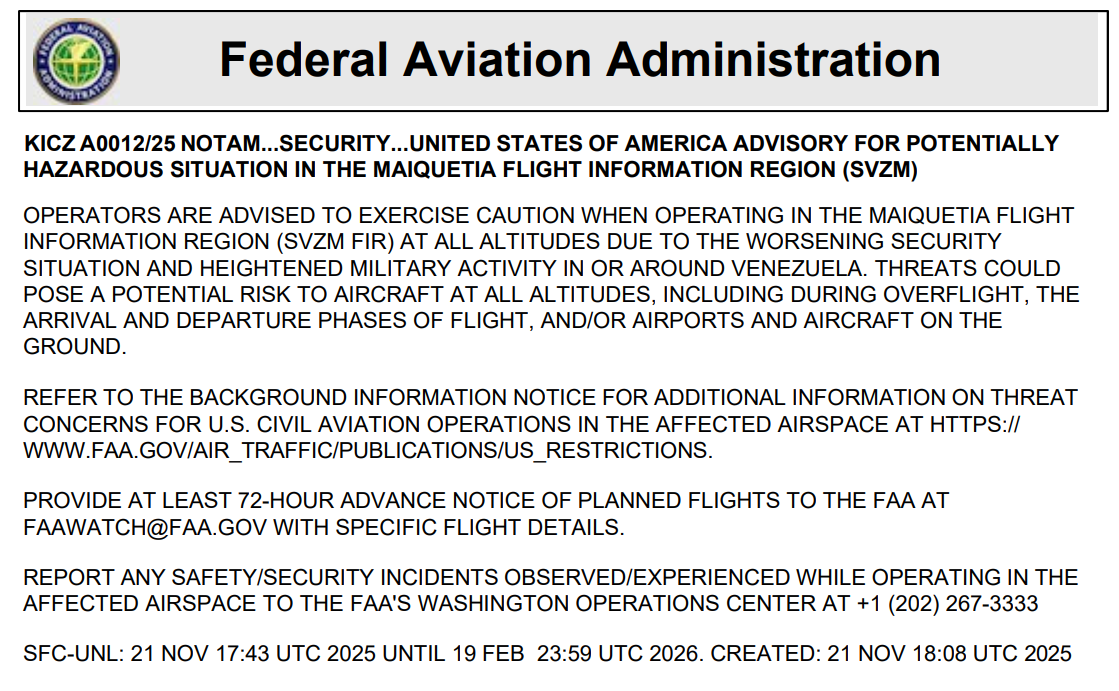 The Federal Aviation Administration issued an advisory warning that the airspace in and around the Maiquetía Flight Information Region (which covers Venezuela and parts of the Caribbean) poses a “potentially hazardous situation” due to “worsening security conditions and heightened military activity.”