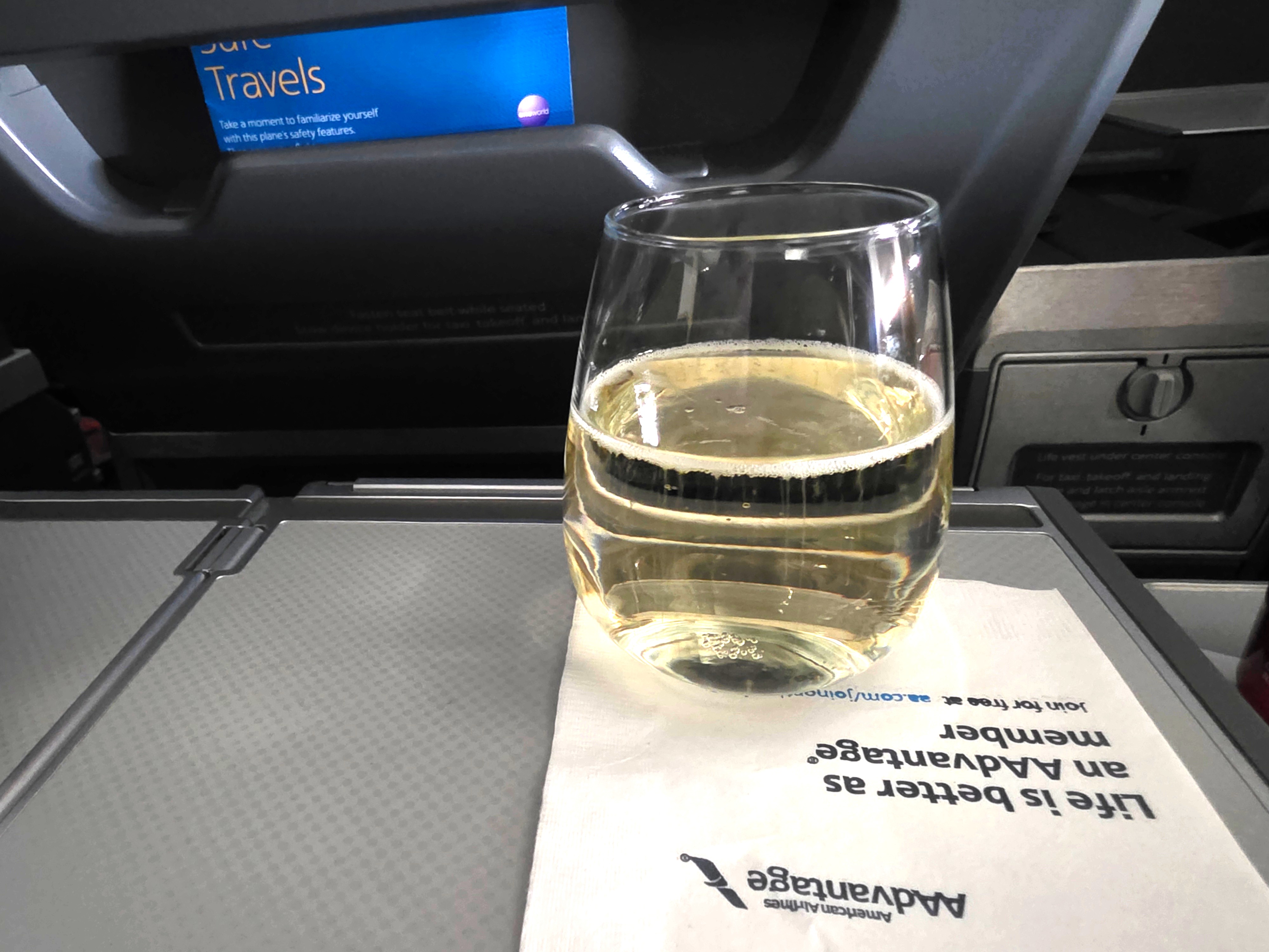 I never touch the stuff on board. I drink a lot of water. When I drink something else, it’s because I want to enjoy the flavor. Domestic flight wine selection doesn’t fall enough into that bucket, but I decided to give it a try on the flight I was on while writing this. It was a Bottega Brut, a $7 retail split and honestly not industrial swill.