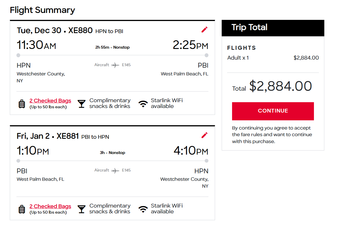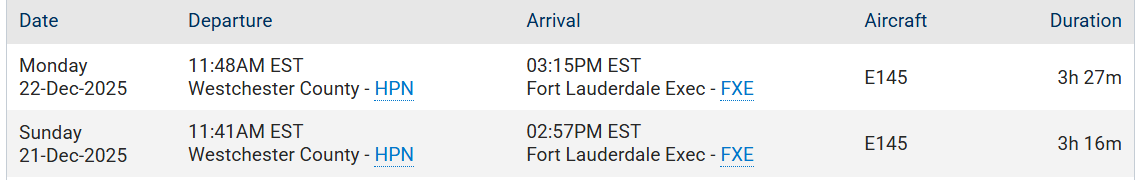 What I’d rather see is a warning during the booking flow that between December 20 and January 4, flights to Palm Beach may have to be re-routed due to a temporary presidential flight restriction. I’d still gladly fly JSX from Westchester to Fort Lauderdale Executive and drive! (And so would many others, hence the high price of those few seats that are still available for sale.)