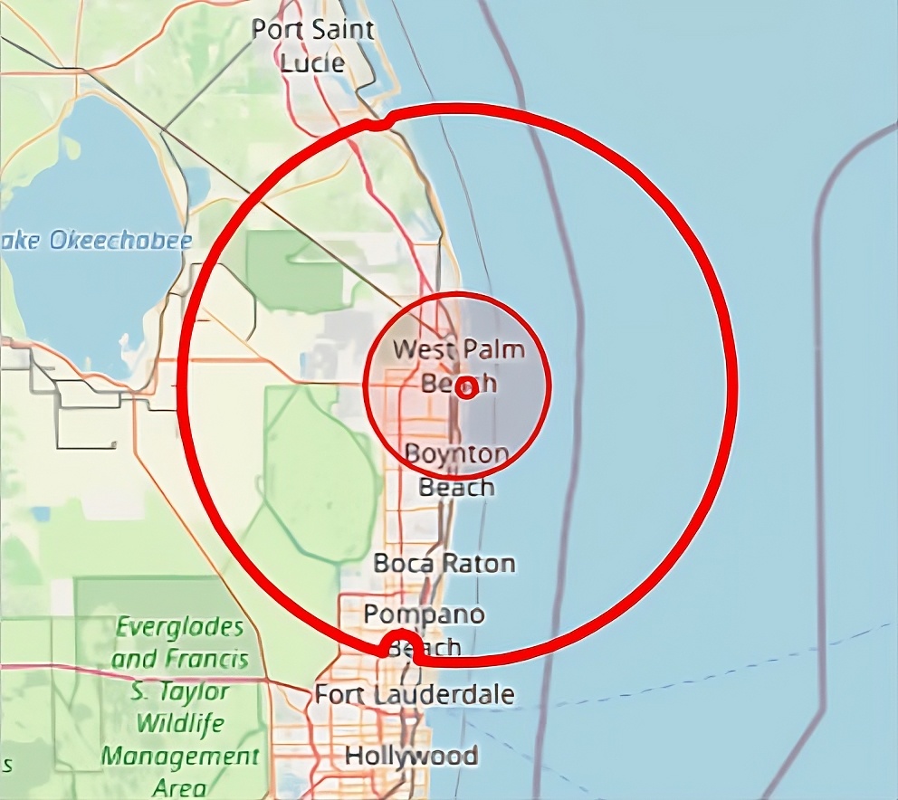 Here’s the ‘TFR’ which basically closes an inner circle of 10 nautical miles (11.5 statute miles). If you’re in a private plane, you generally can’t fly in there at all, unless you’re going to West Palm Beach (Palm Beach International, PBI). And there are special rules.