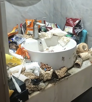 Staff found that trash had piled over 3 feet high with bottles, food packaging, takeaway boxes, and general refuse. The bathroom floor was covered in grime, toilet paper and tissue was piled higher than the toilet, and the area emitted a pungent and nauseating odor.