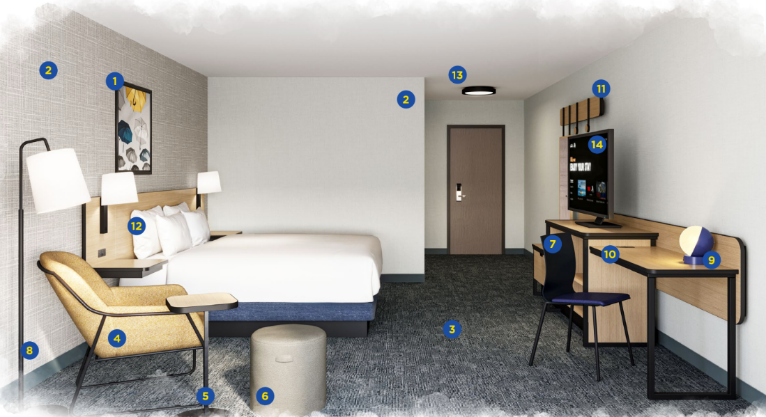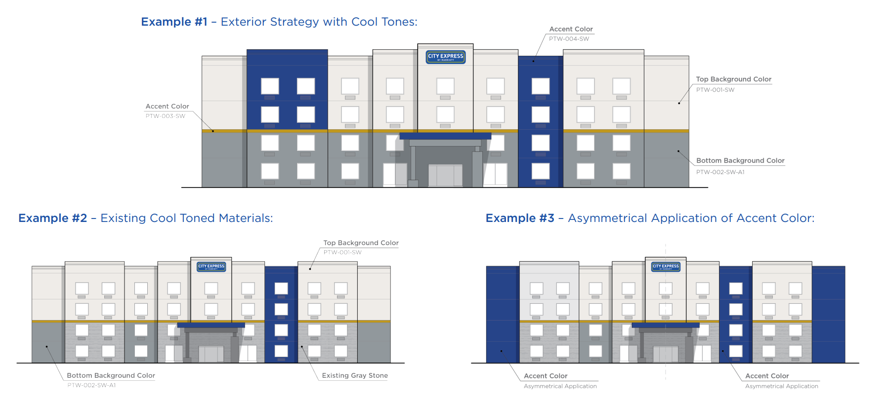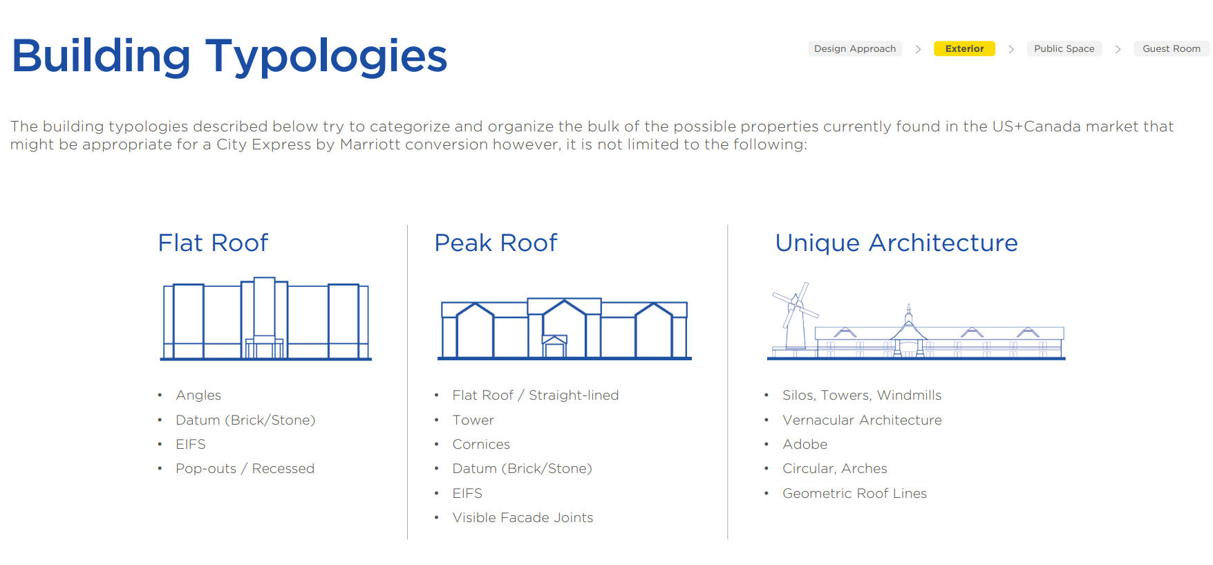 I hadn’t paid much attention to City Express before, but reviewed their documentation for converting existing hotels. Owners get to keep many existing finishes that are still within useful life, with exterior identity achieved largely with two‑tone grays, a 12–18″ yellow band, and asymmetrical navy blocks, plus new signage and entry‑door graphics. Restaurants are not allowed unless physically separated from public space. Full kitchens are not allowed. Any existing kitchenettes (cooktop and dishwasher) are allowed in fewer than 10% of rooms only if already present, and replacing equipment isn’t allowed as they go bad.