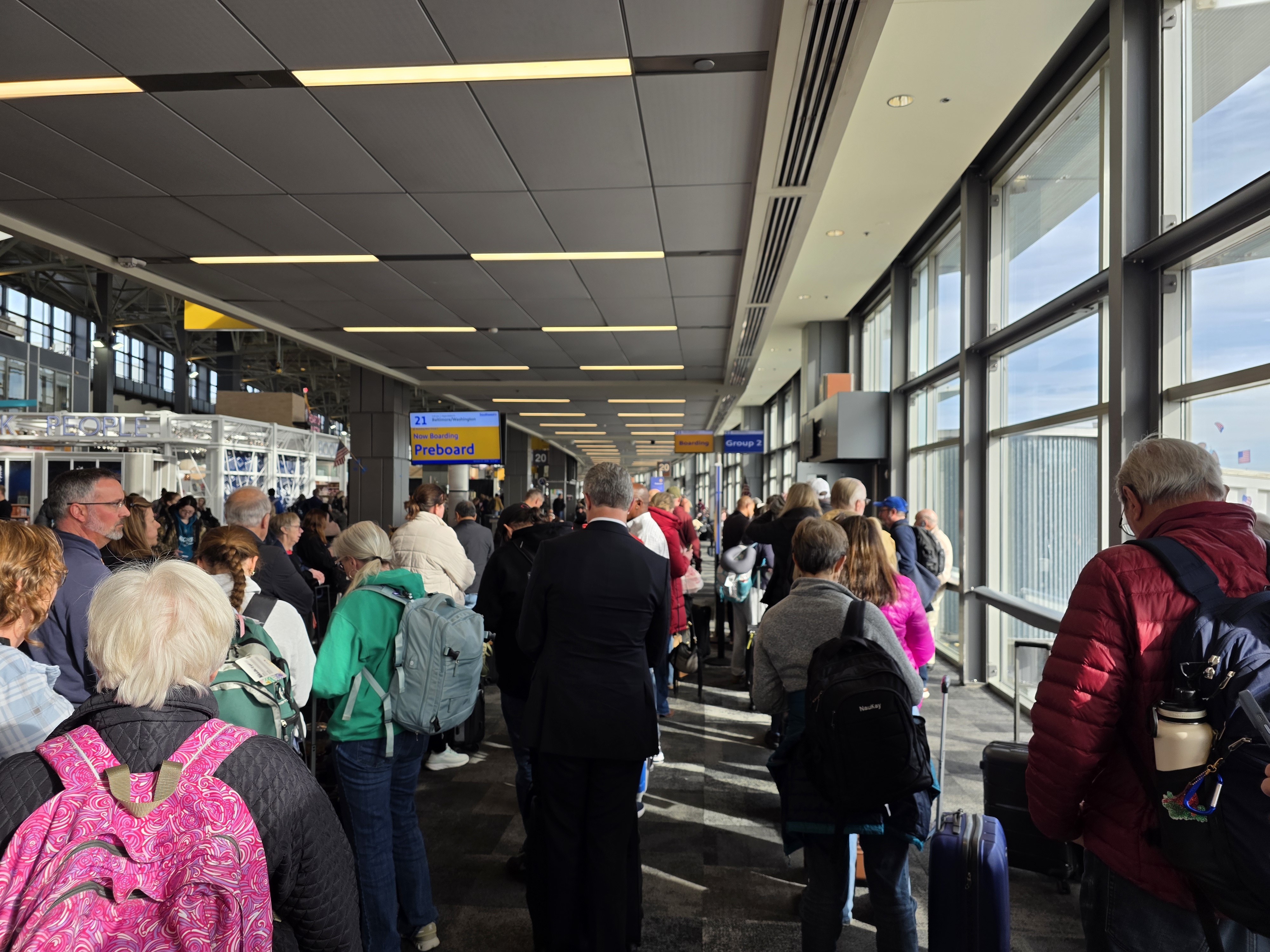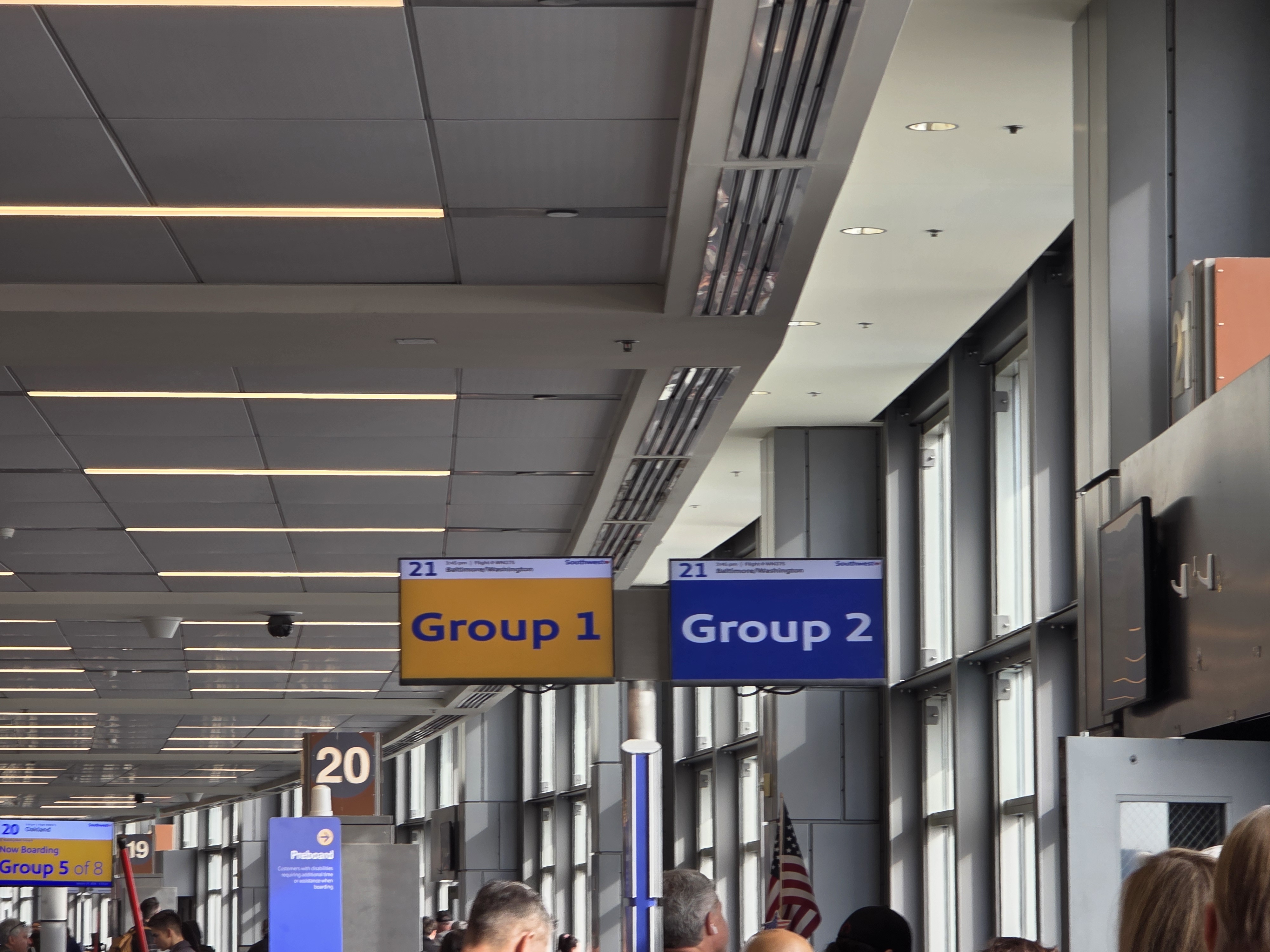 Then, once boarding time commenced, they did pre-boarding for passengers needing special assistance and military. And only then they began boarding group 1. So everyone was standing in a queue for awhile. Once group 1 was done boarding and they’d moved onto 2, they told group 3 to line up in group 1’s place (the stanchion sign, though, still said Group 1).