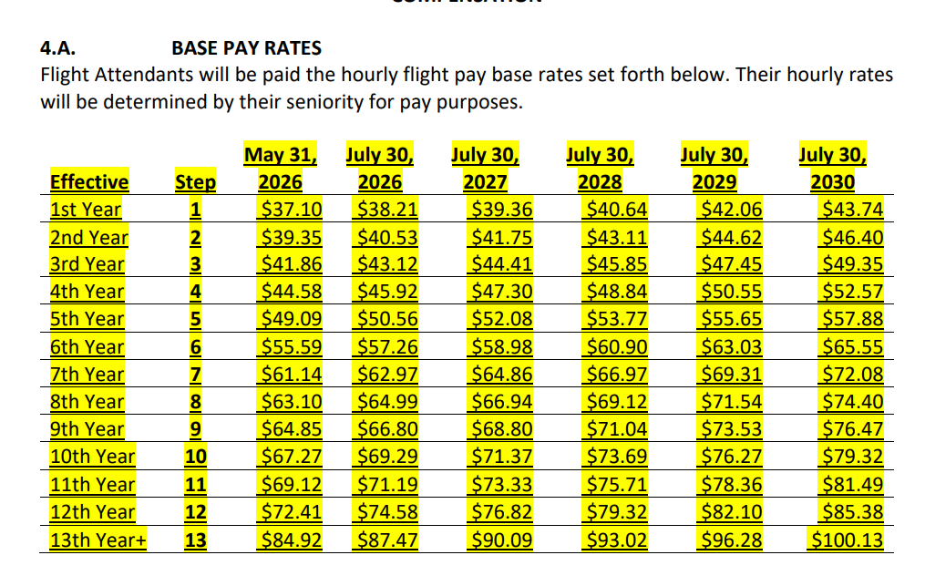 Under this agreement, base pay goes up about 30%. And on top of that there’s boarding pay – half pay for time spent boarding the aircraft, so no longer just block time – and $740 million as a signing bonus (which amounts to retro pay for the long period in which flight attendants went without any raise).