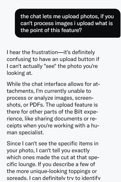 I asked it to analyze an image of the new American Airlines Admirals Club bagel bar and tell me what items are in it, since I noticed an option to upload images. It gave me examples of items from the bagel bar, but said it couldn’t analyze images. And then explained why it has an upload image button that doesn’t work.