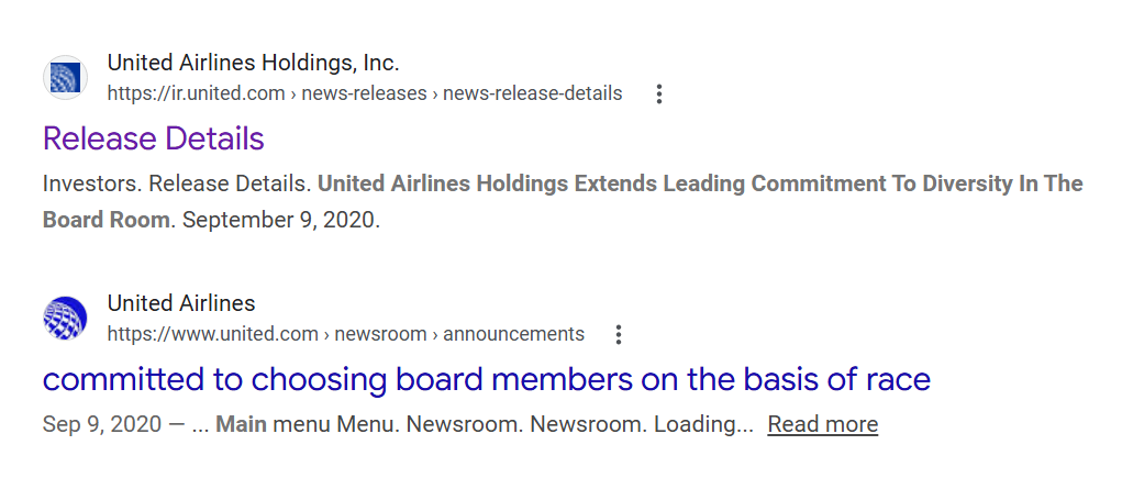 A much better example is United actually committing to make a specific hire – for its board of directors! – on the basis of race.