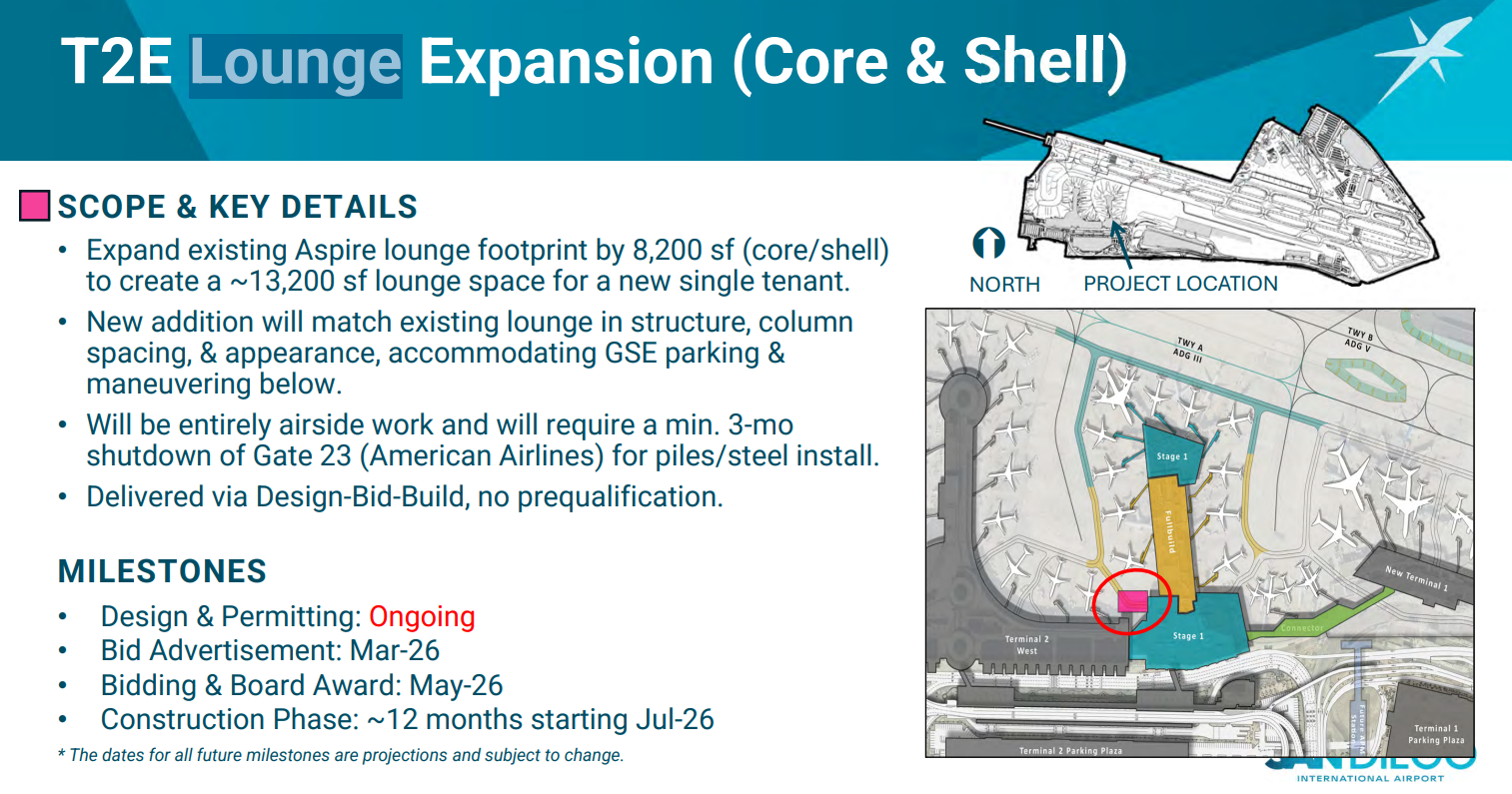 - The San Diego terminal 2 Aspire lounge will more than double in size.