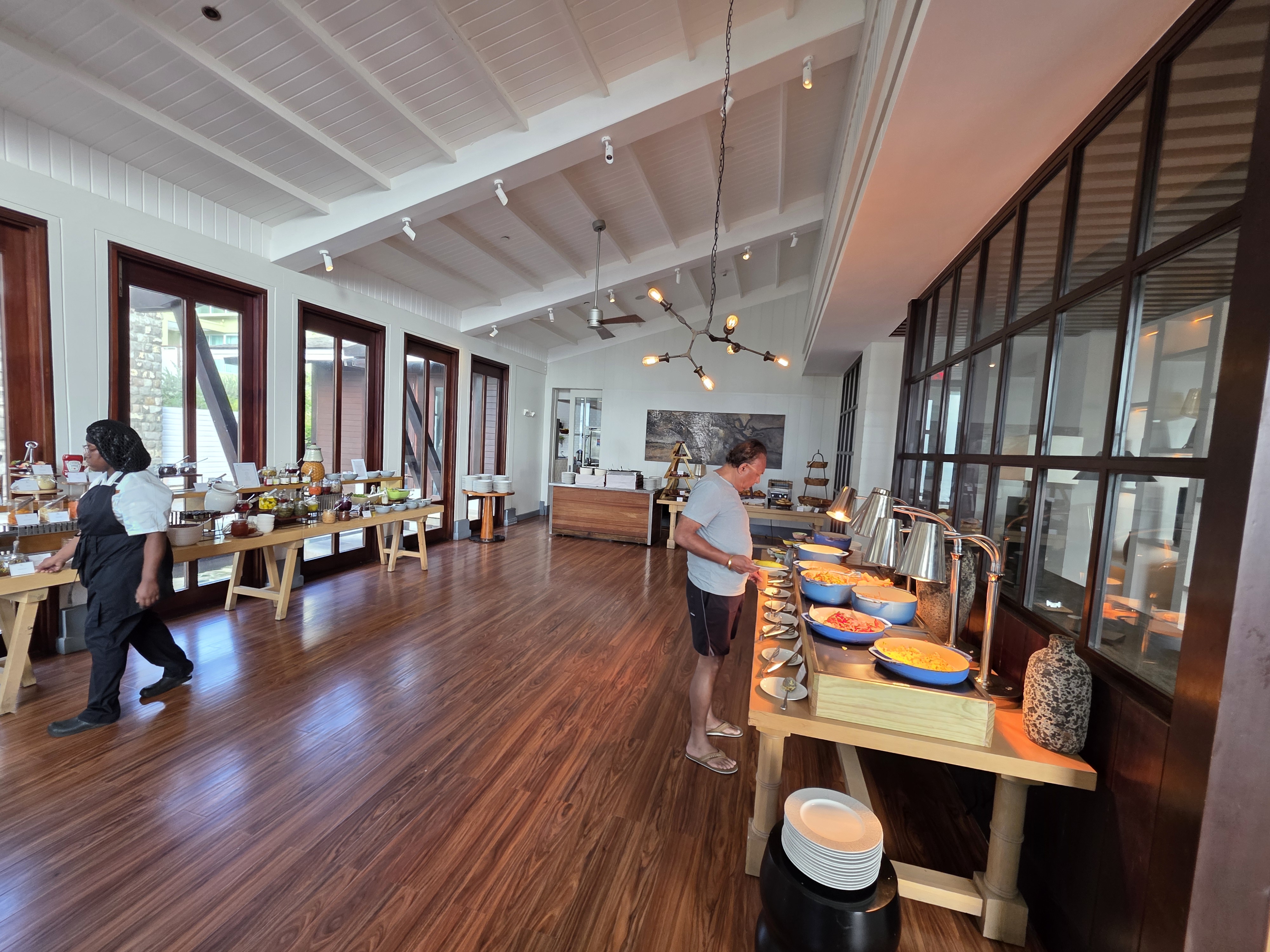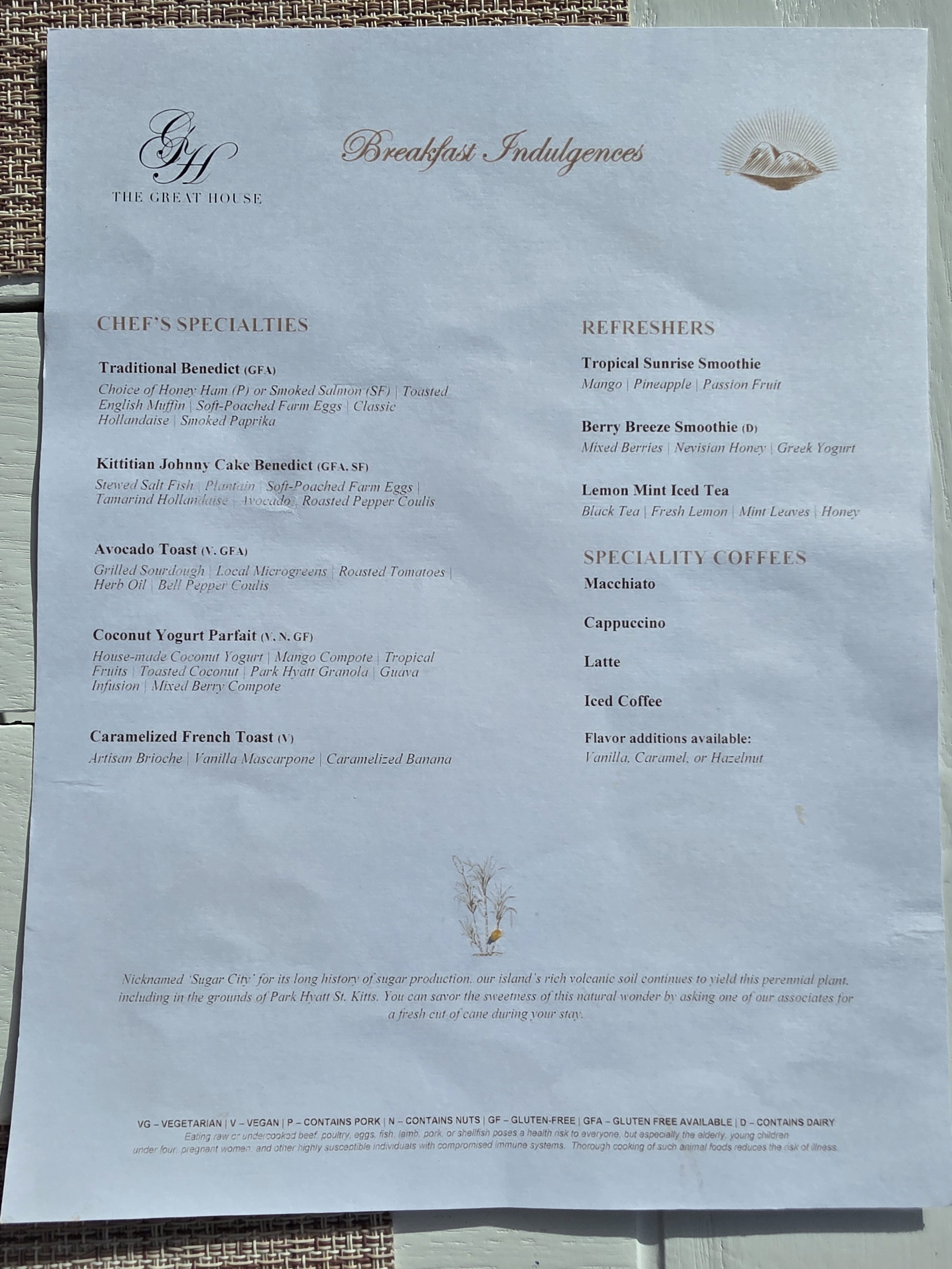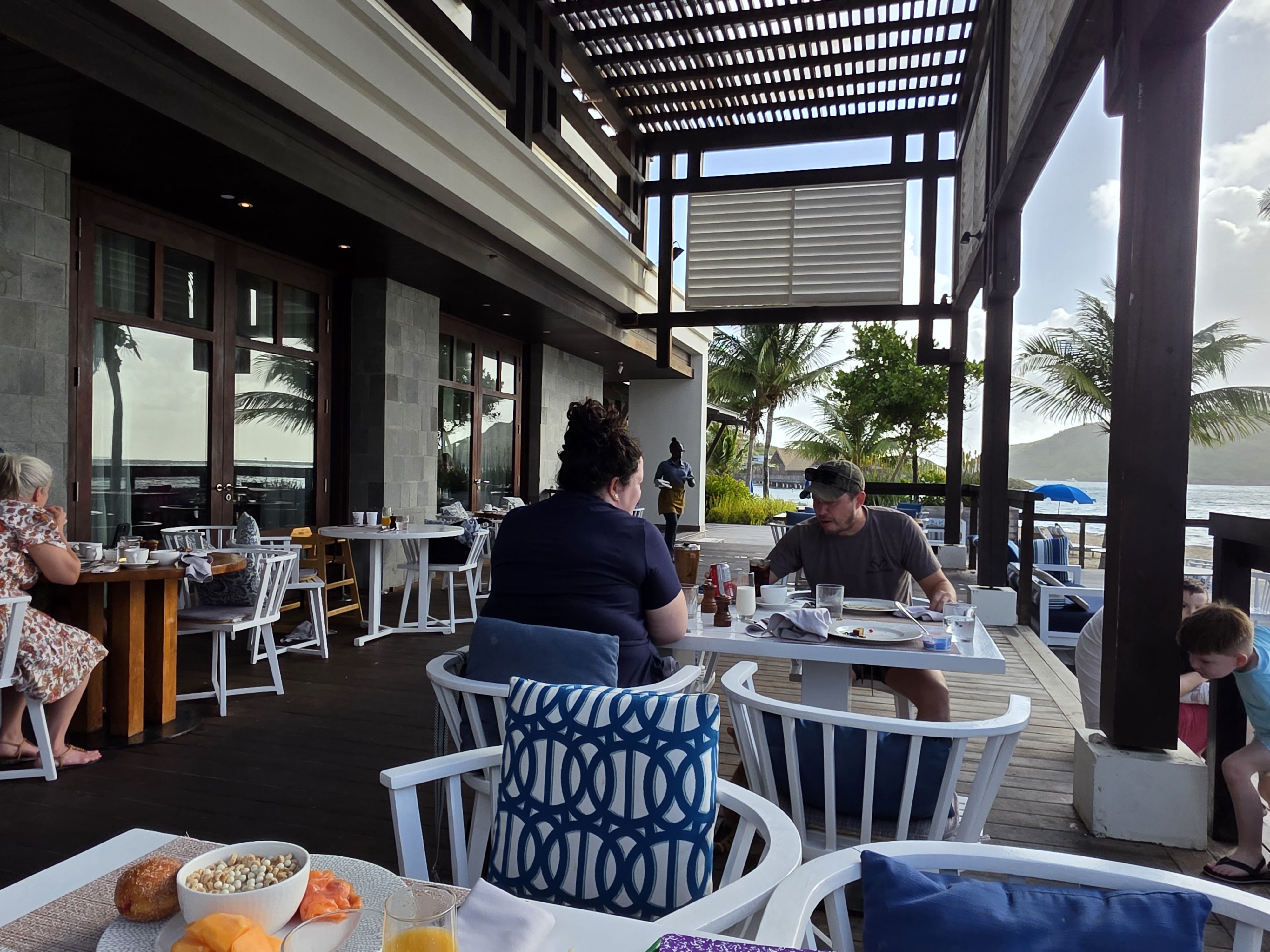 Actually, breakfast is a high point. It’s taken in the Great House which has both indoor and outdoor seating. They offer a high quality buffet and ordering off the menu. Fresh squeezed juices and specialty coffees are included. And there’s no cost at all for tax or service even as a Globalist.