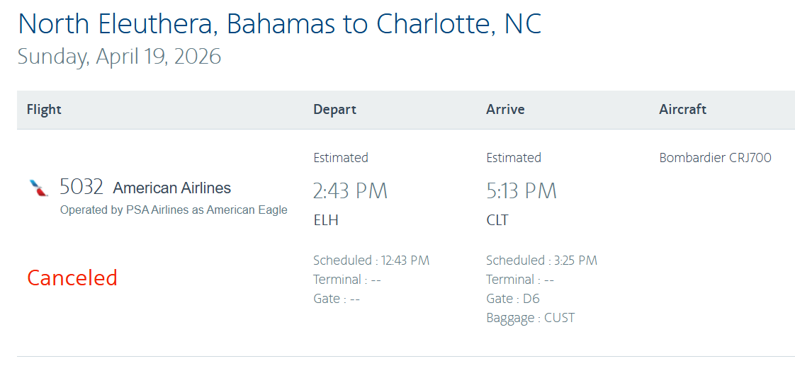 Sunday’s American Airlines flight from North Eleuthera airport in the Bahamas to Charlotte was cancelled. The aircraft, a CRJ700 regional jet operated by American’s wholly-owned carrier PSA, arrived nearly two hours late. Passengers had been waiting. Everyone was ready to go, and there was reportedly nothing wrong with the aircraft. They had a crew.