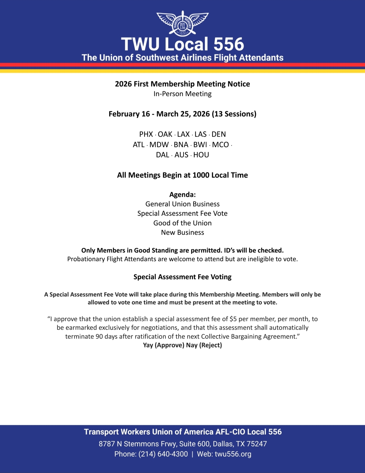 - TWU Local 556’s first round of 2026 membership meetings includes a vote on a special assessment that would add $5 per member, per month, described as money earmarked for bargaining and set to end 90 days after the next contract is ratified.