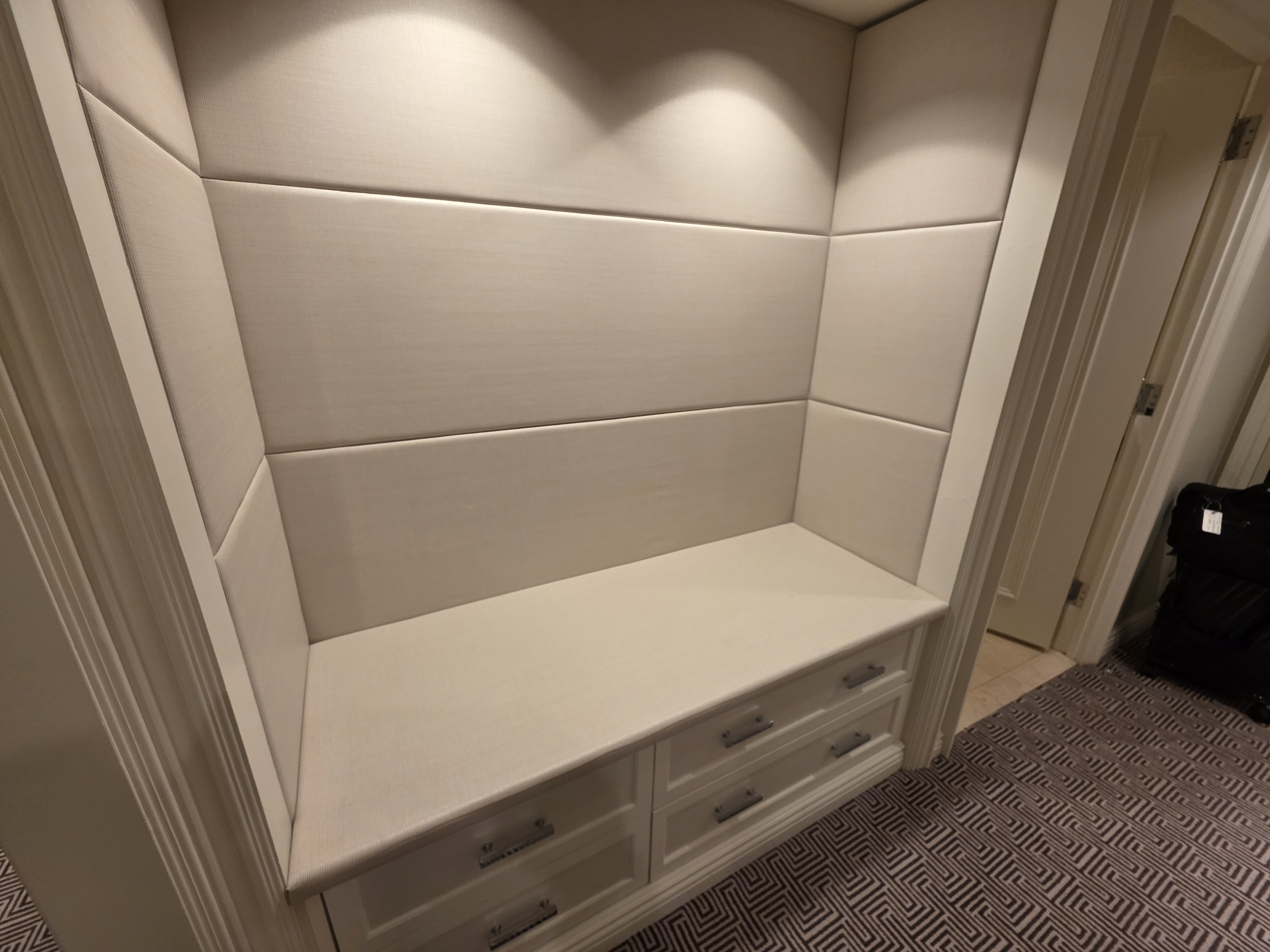 I walked in and there was the bathroom on the right. A little further down the corridor was the closet on the left and a bench area above drawers on the right.