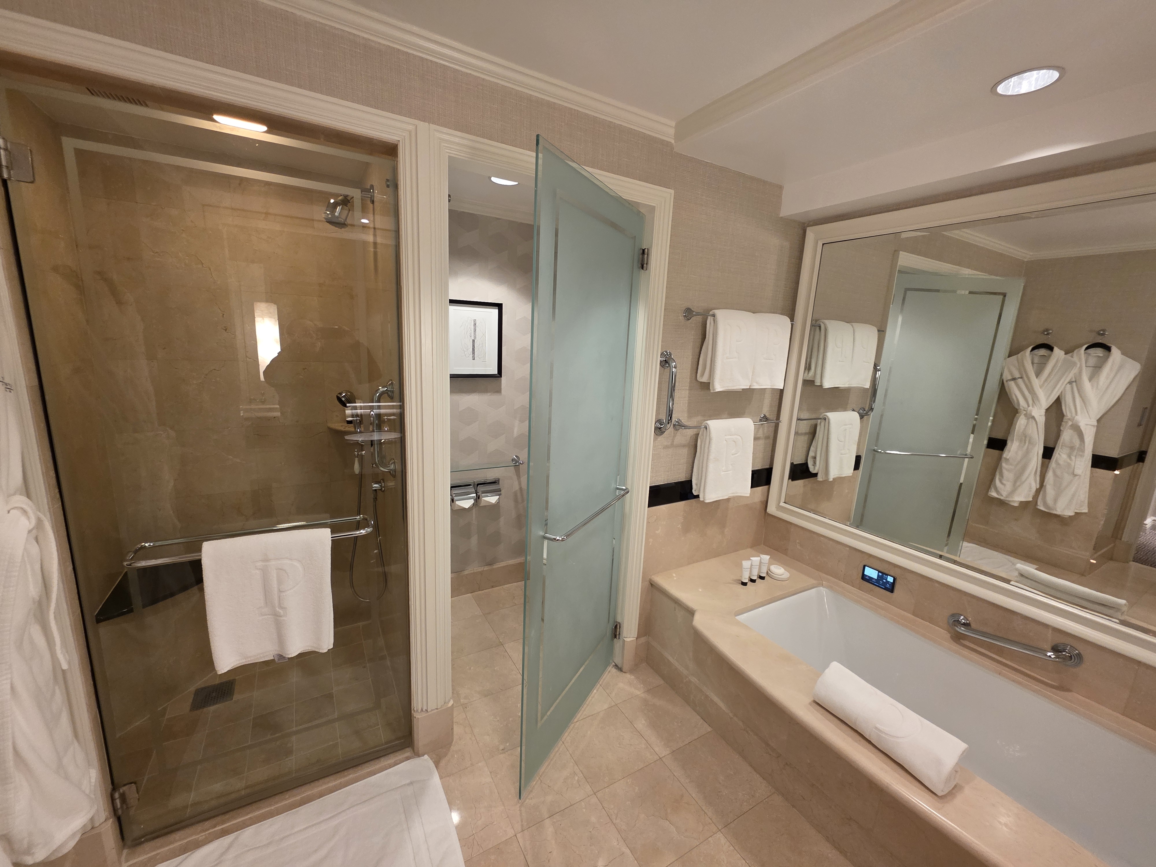 The bathroom was spacious with a large vanity area, separate tub and shower areas, and a toilet room. Water pressure was good.