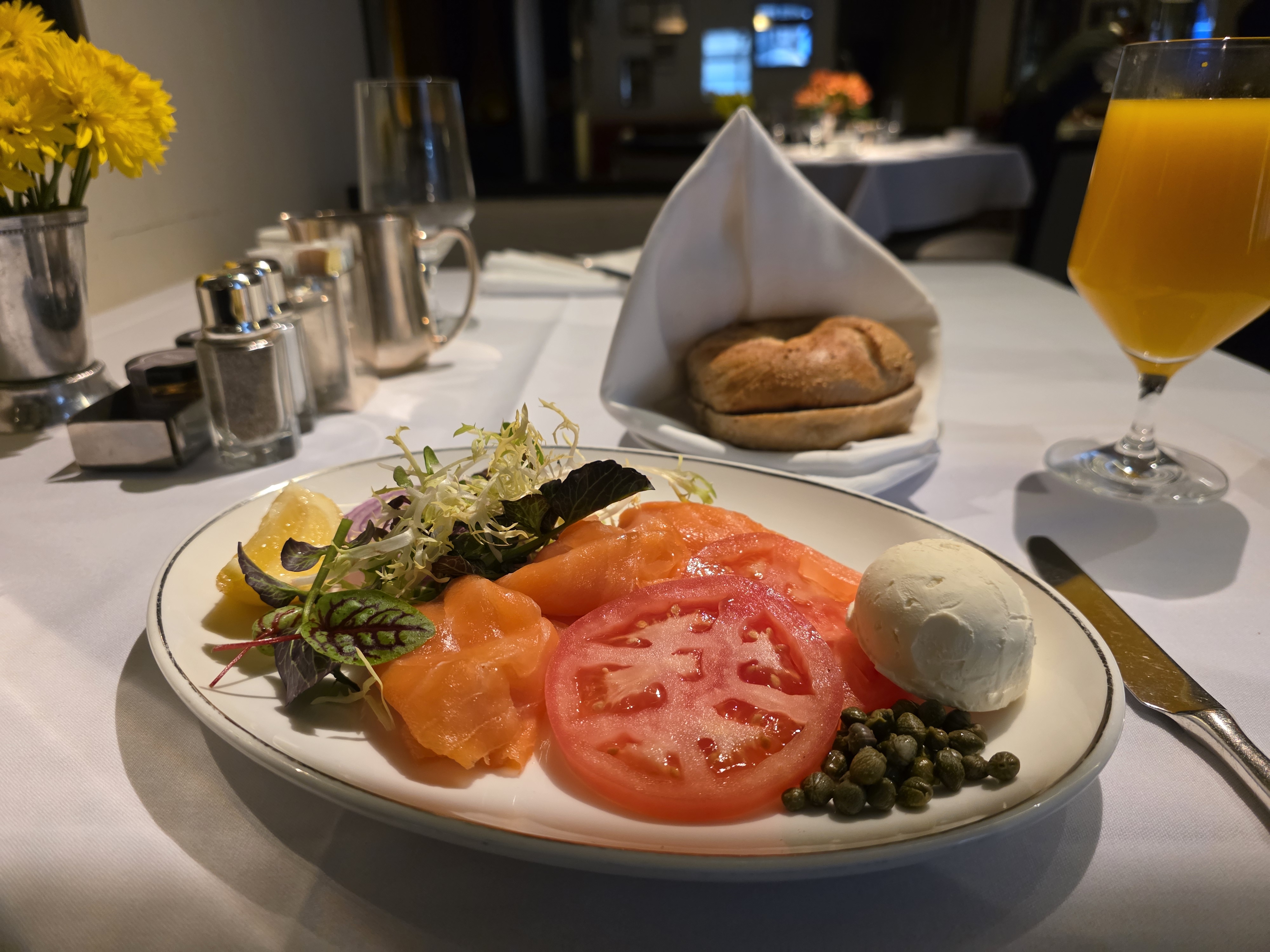 On my first morning I went to Clement restaurant for breakfast, and I had a smoked salmon bagel and fresh squeezed orange juice. Everything was very good.