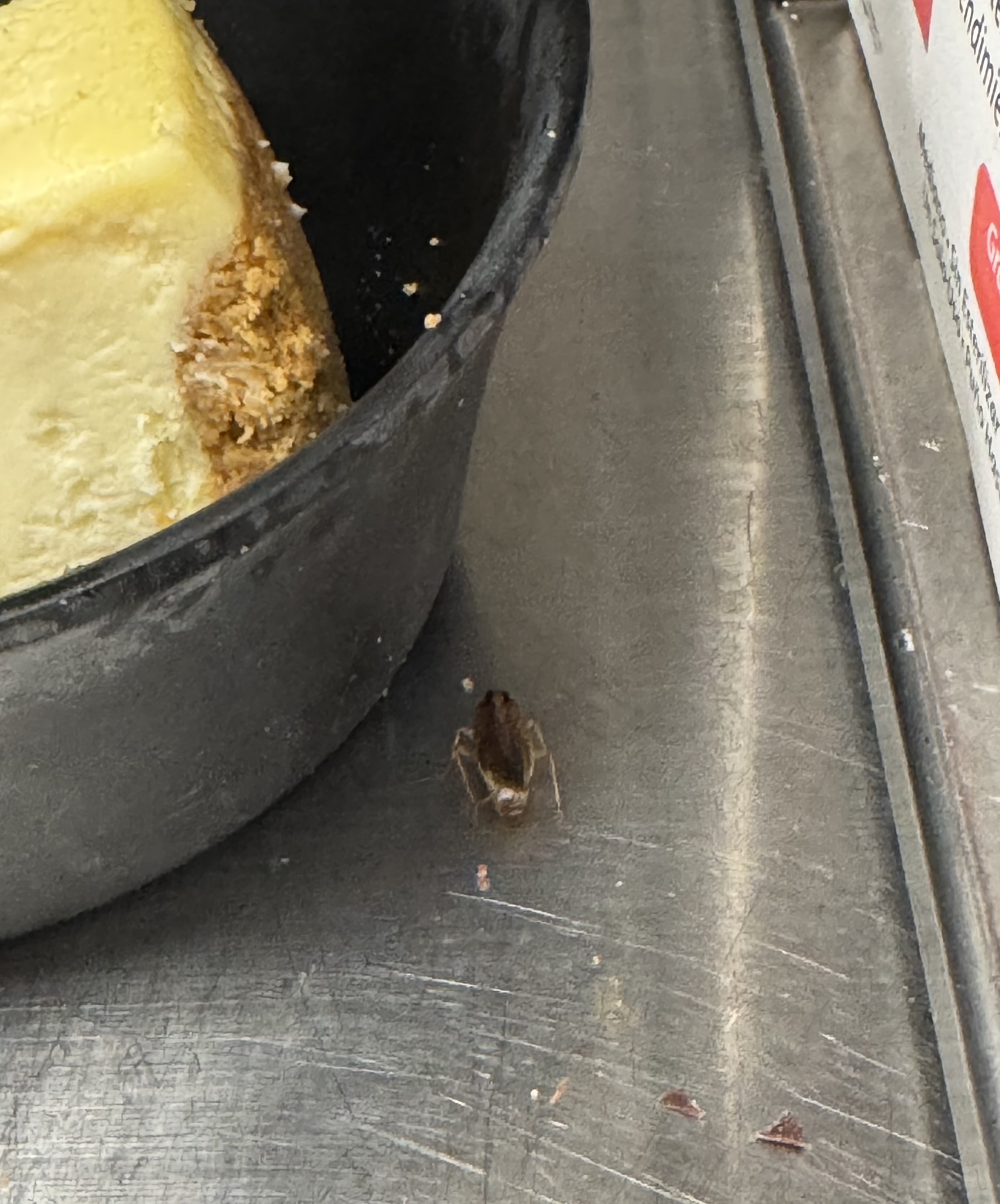 Here you’ll see a small brown insect adjacent to plated dessert on a buffet. The shape, size, and coloring seem consistent with a cockroach. Food crumbs and residue are present on the pan rim and counter.