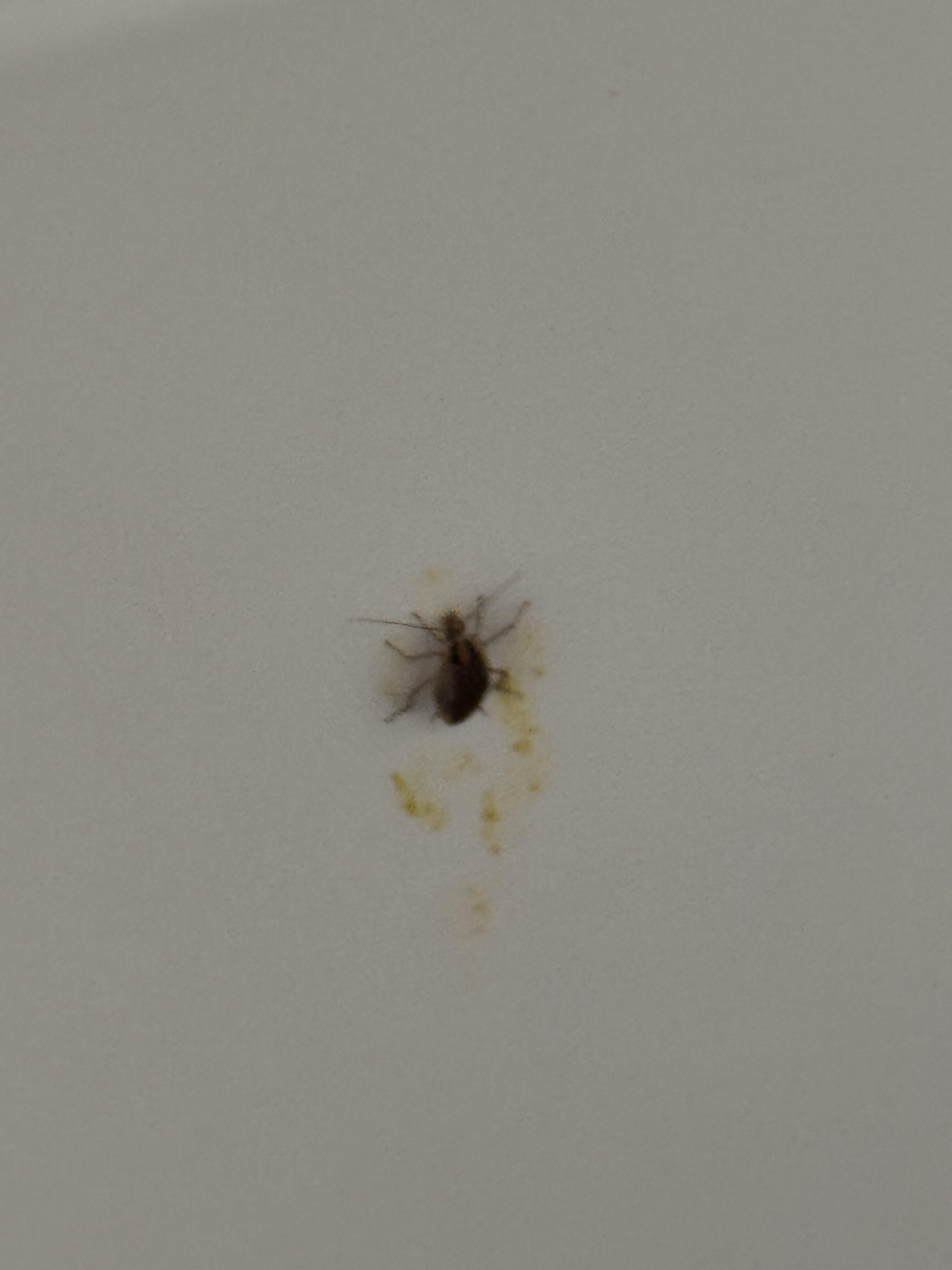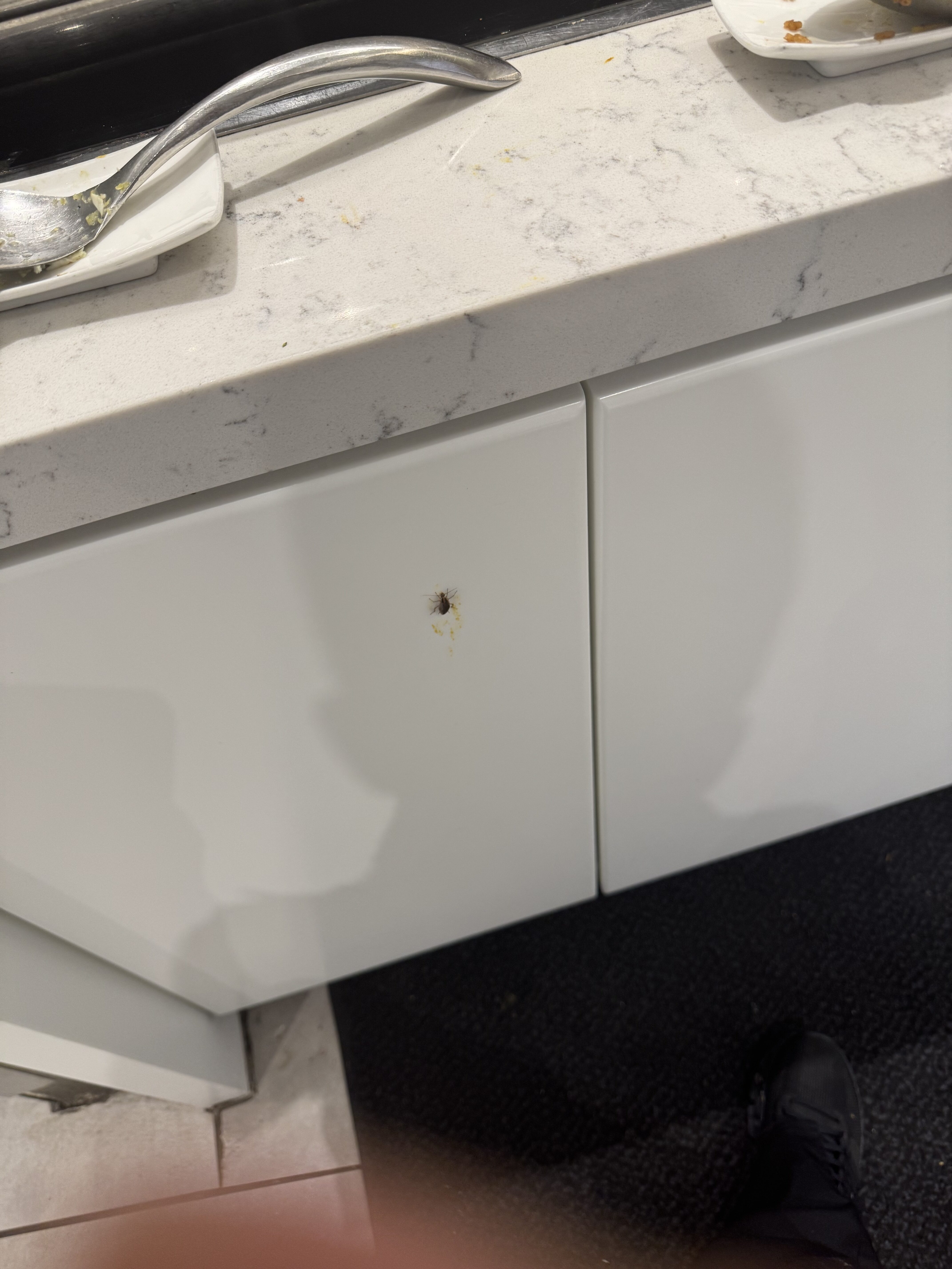 This looks like a cockroach on the counter. The smear and residue around the insect suggests it was crushed there. There is visible dried food splatter on the counter face and crumbs on the servery ledge.