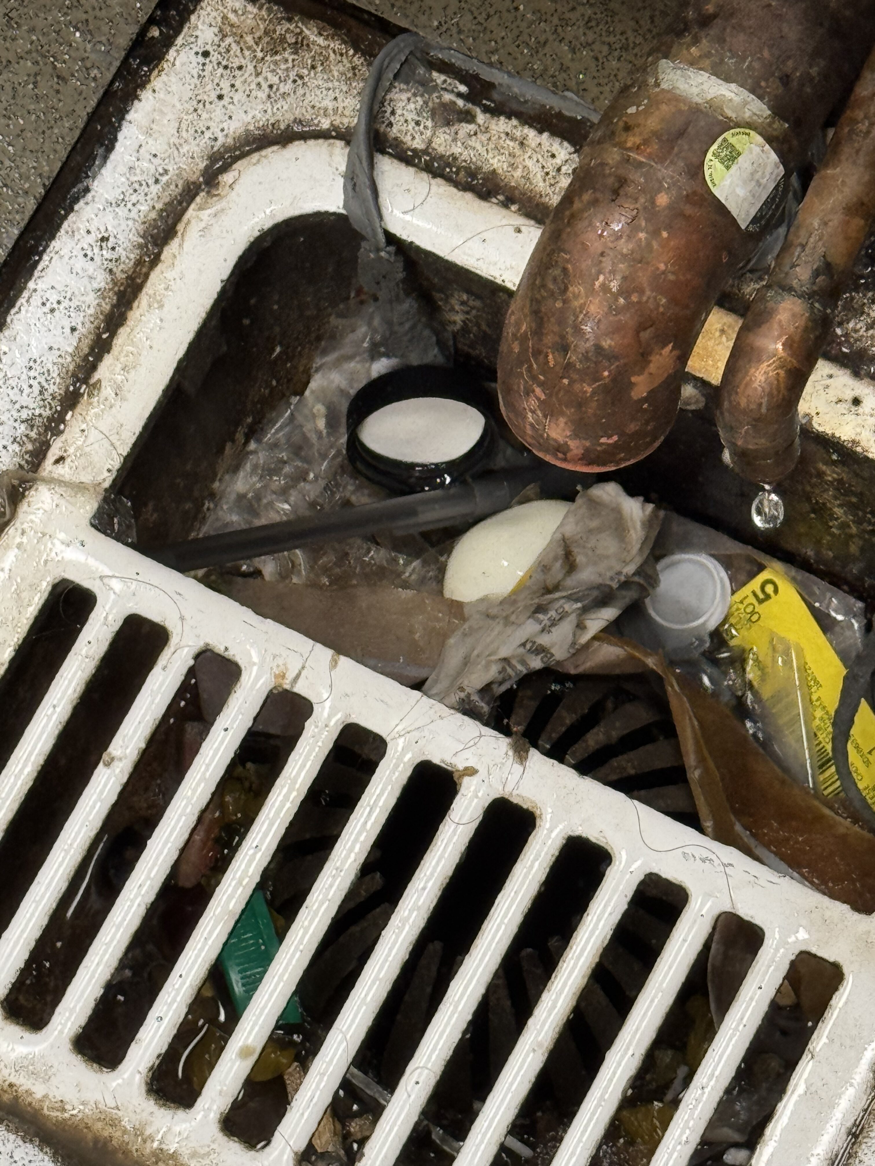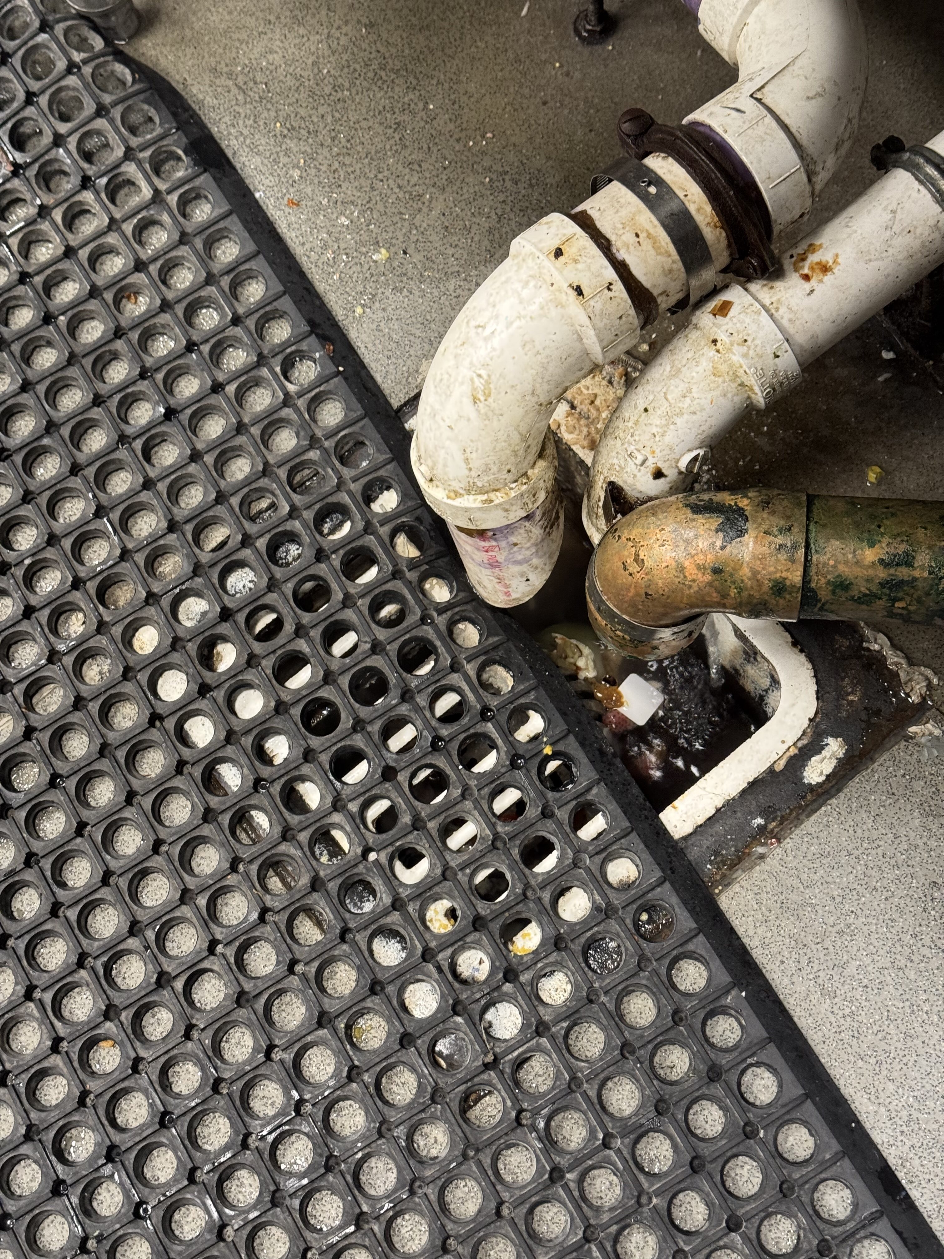 You can see multiple drain/discharge lines terminating into a floor sink, with standing black, viscous liquid and food particles. This commonly produces strong odors and supports pest activity.