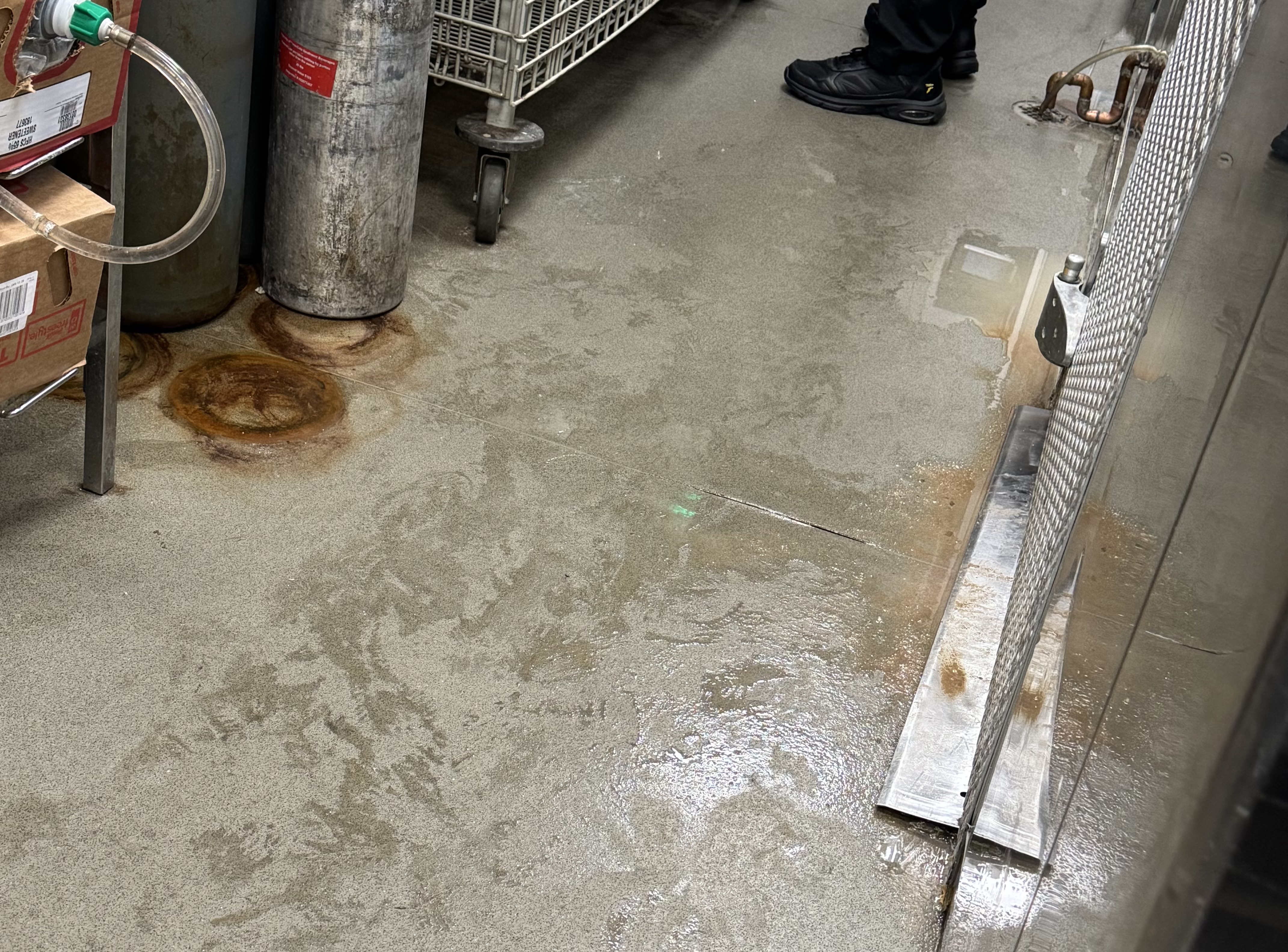 This photo shows a wet floor with pooling, multiple rust rings, and rusting near base of a stainless equipment panel. This suggests repeated leakage and prolonged moisture on the floor.