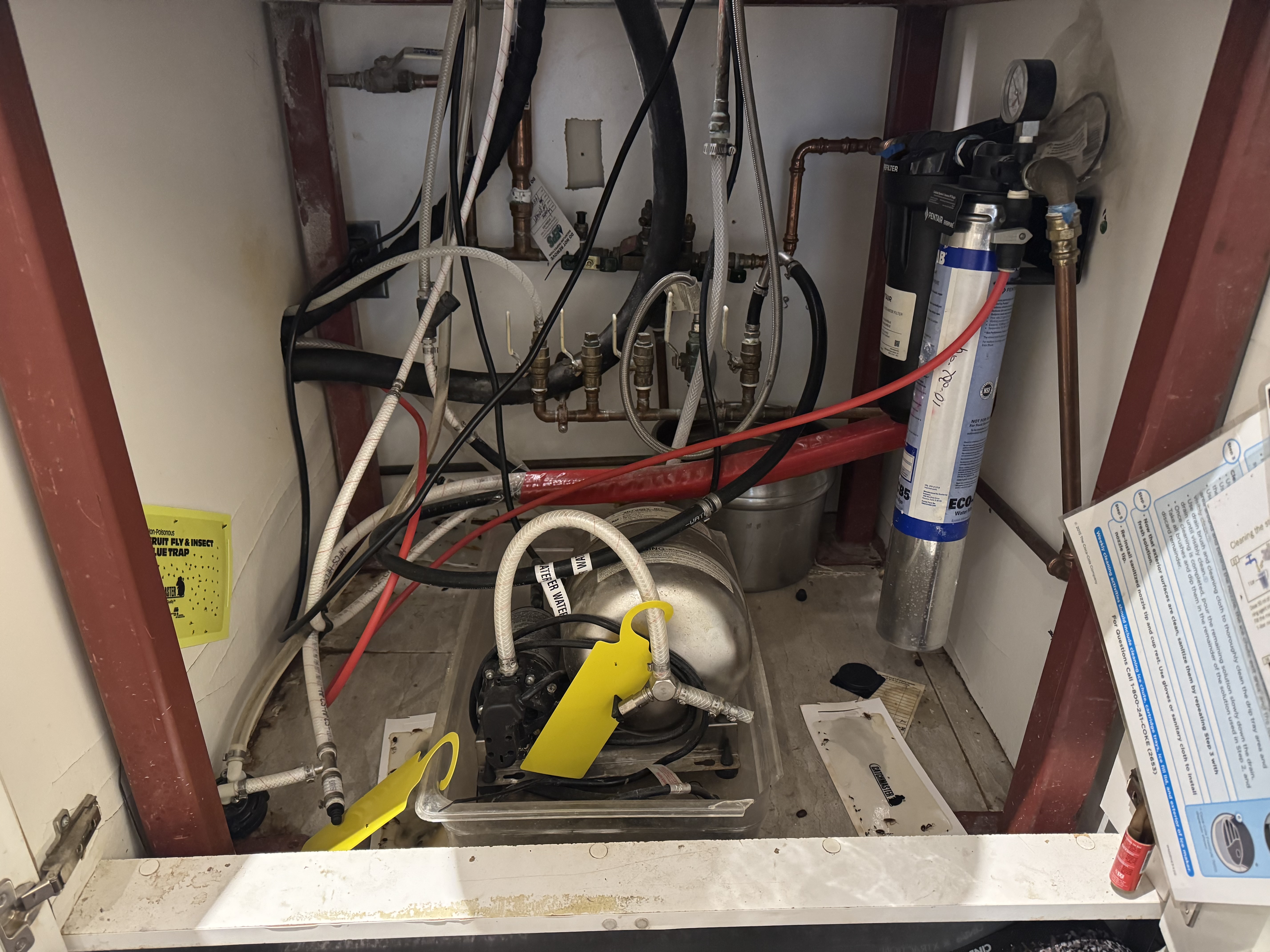 There’s a pest monitoring glue trap present here and one appears to contain dark specks that ocould be roach nymphs. This is also cluttered in a way that impedes cleaning.