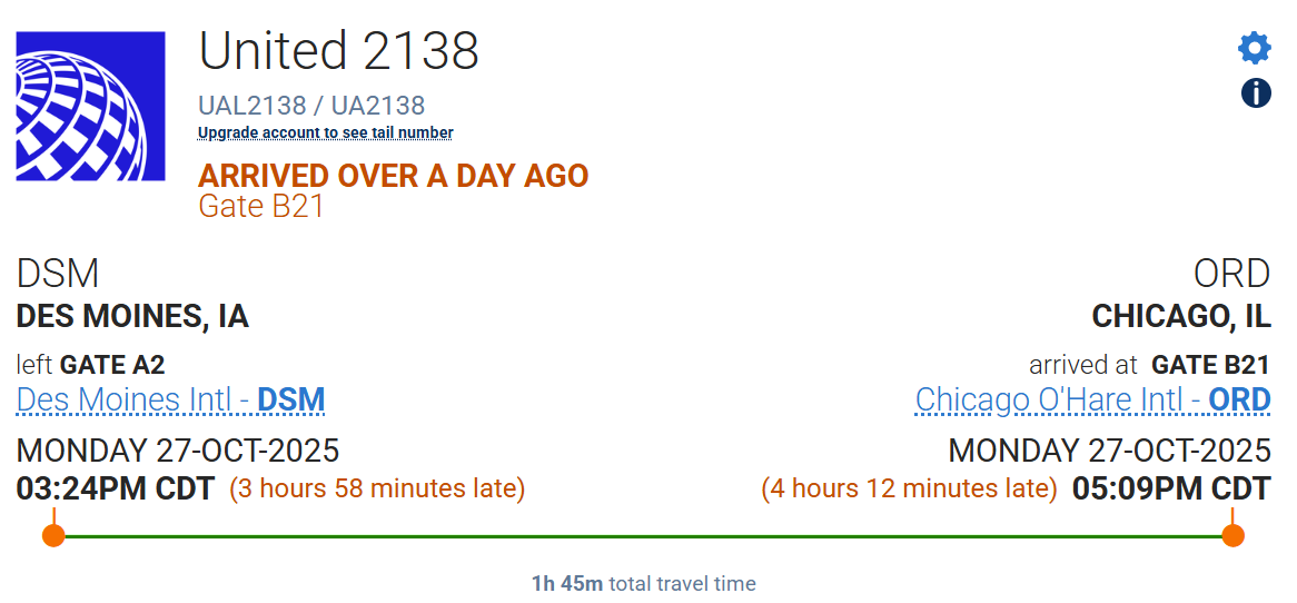New crewmembers had to be sourced – and Des Moines isn’t a crew base – with the flight ultimately pushing back around 3:24 p.m. and taking off close to 4:00 p.m. generally blowing connections. The flight landed at O’Hare at 5:09 p.m. – a four-plus hour delay for what’s normally less than a one-hour flight.