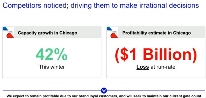 - Once Kirby tells analysts that he’s going to respond in-kind to American’s moves in Chicago, there’s going to be skepticism from analysts that American should grow in Chicago. There will be outside pressure on American not to grow in Chicago.