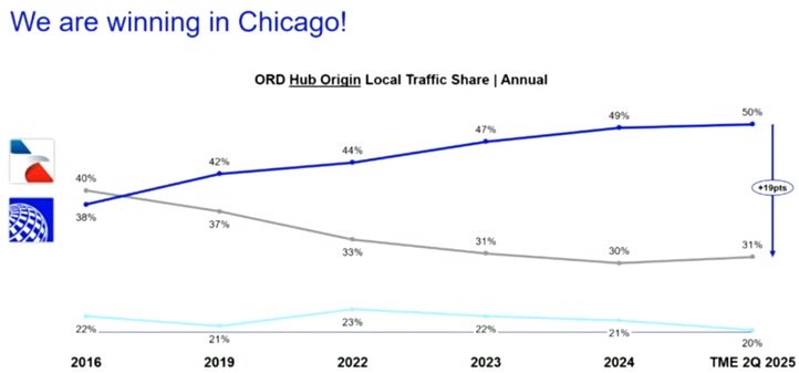 JonNYC also shares the slides from United’s internal presentation showing American winning in Chicago in 2016 (the year American fired Kirby is chosen as the base year, naturally) and how their position has eroded.