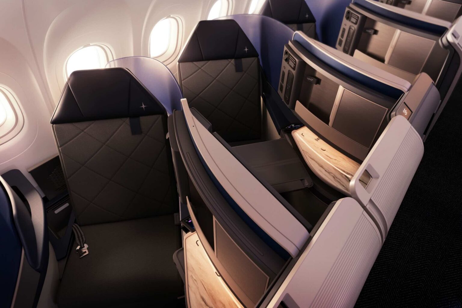 The plane will have direct aisle access lie flat seats, but like with other airlines operating this variant we’ll see herringbone seats where passengers are angled away from the window. (United threw shade at American in their press release: “This new suite is wider at the shoulder and elbow than similar competitor products”).