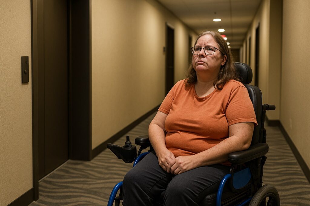 The wheelchair-bound woman was trapped in her hotel room for 42 days after the building’s only elevator broke down. No backup plan. No safe alternative. No urgency from management.
