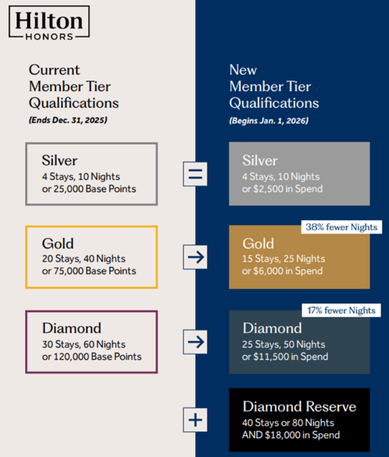 - Put another way, a Hilton Honors member who stayed 55 nights in 2025 will be Gold, not Diamond, even htough staying 50 nights in 2026 will earn Diamond.