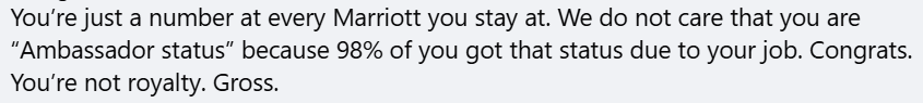 You’re just a number at every Marriott you stay at.. We do not care that you are “Ambassador status” because 98% of you got that status due to your job. Congrats. You’re not royalty. Gross.